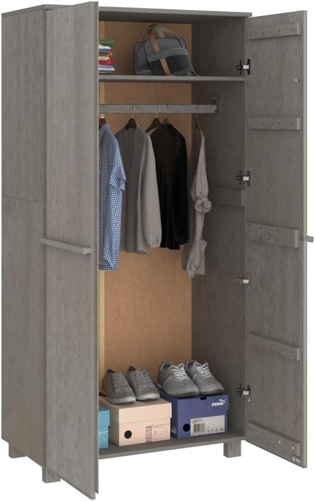 What stood out immediately was the robust construction using solid pinewood, providing a sturdy and stable storage solution that feels built to last. The light gray finish adds a touch of understated elegance, seamlessly blending with various bedroom decors. We found the dual-compartment design highly practical: the spacious bottom area features a hanging rod perfect for longer garments, while the smaller top compartment is ideal for folded clothes or accessories.Despite its generous height, the wardrobe’s relatively compact footprint makes it an excellent choice for rooms where space-saving is a priority. The wooden handles enhance the overall aesthetic, maintaining a cohesive, natural look.