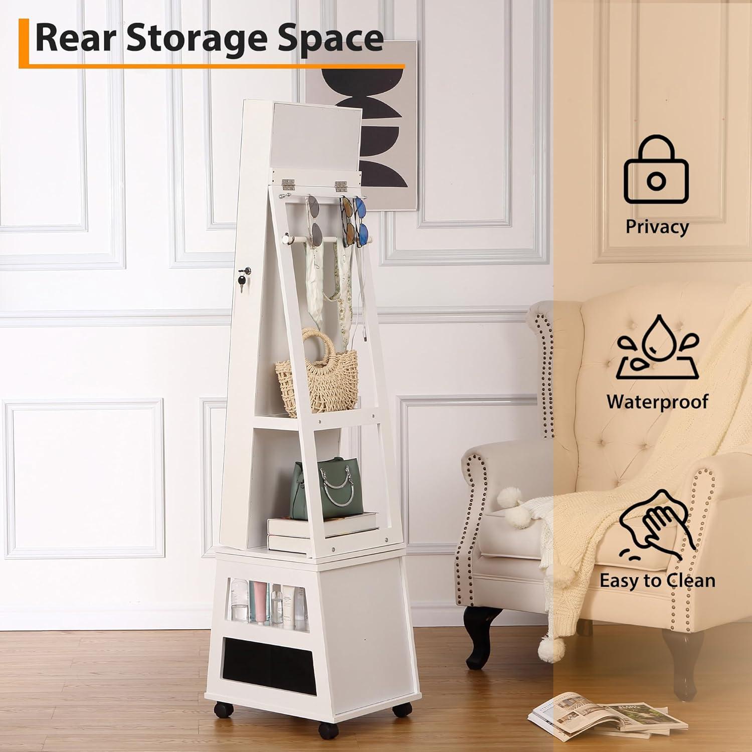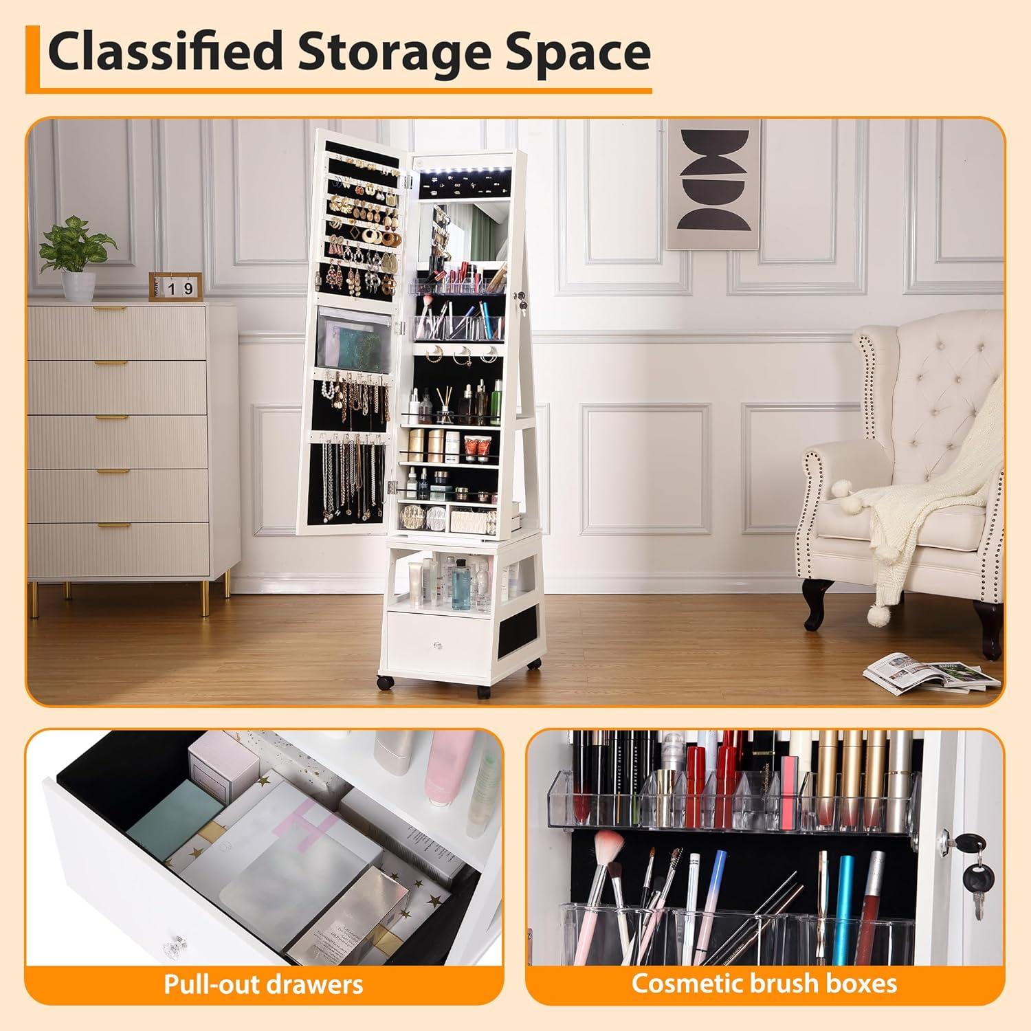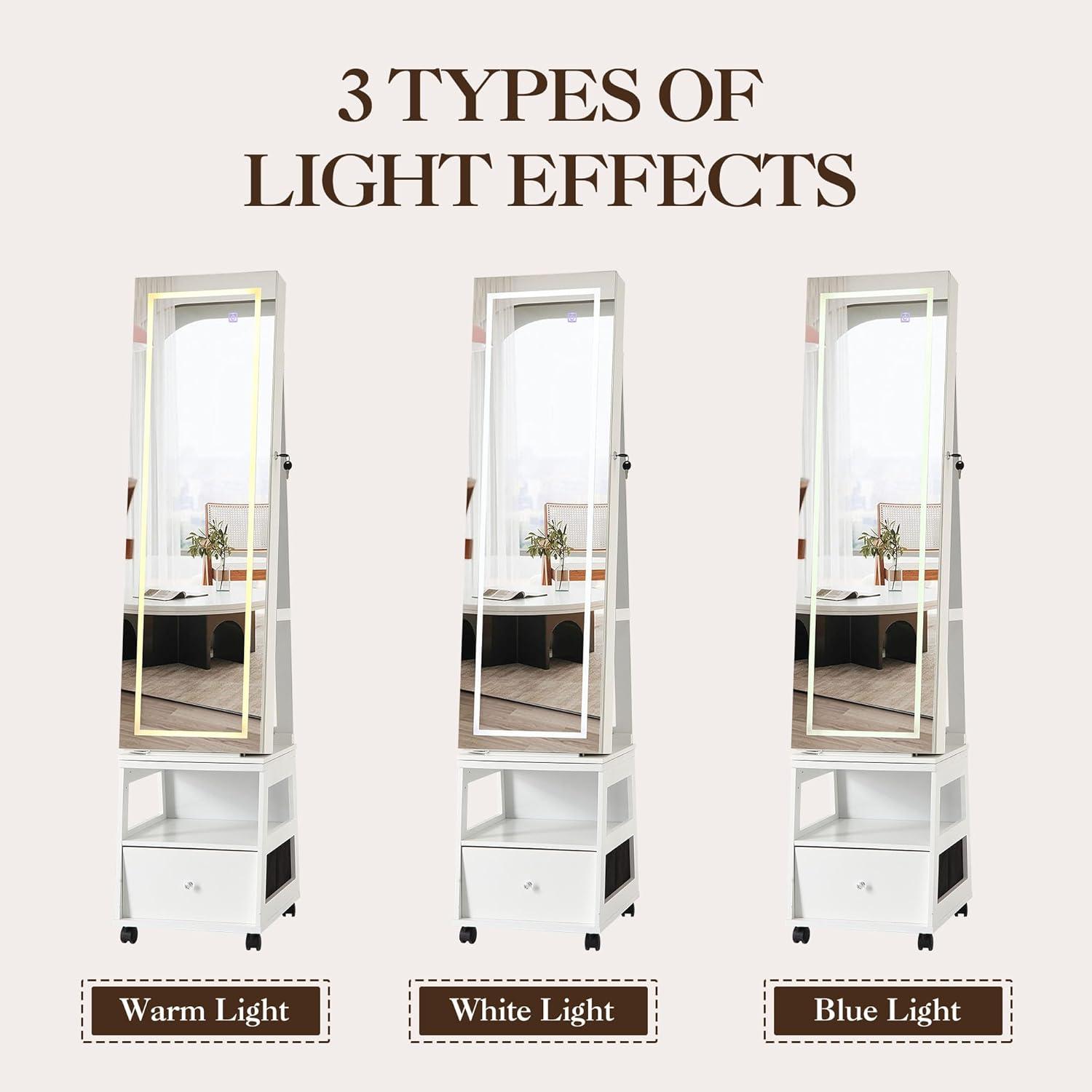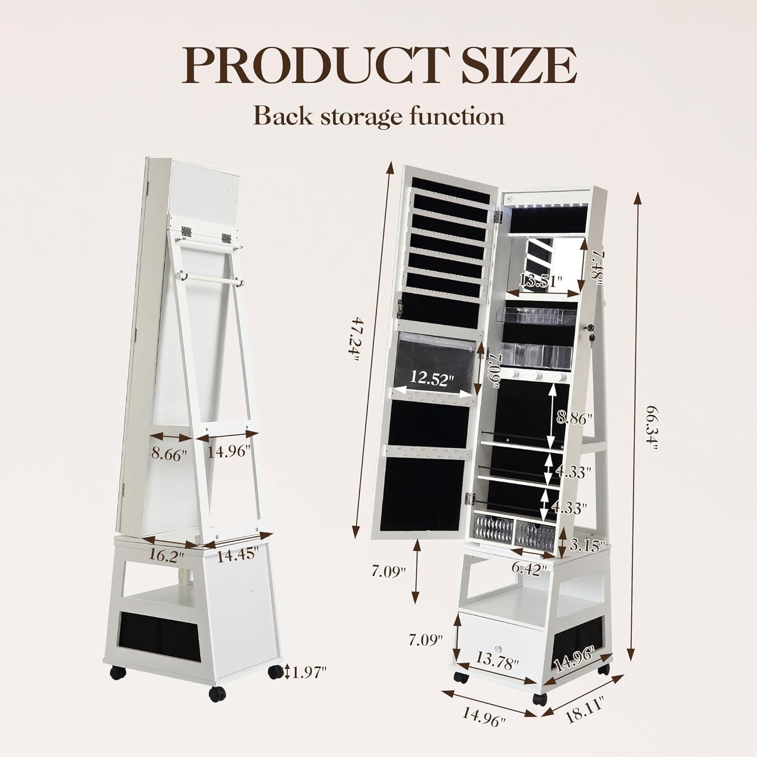 We appreciate the impeccable blend of elegance and functionality that defines this jewelry cabinet. Its sleek white finish pairs beautifully with high-quality construction, making it a standout piece for any bedroom decor. the full-length mirror, enhanced with three adjustable lighting modes (white, warm, and cold white), not only provides a crystal-clear reflection but also ensures the perfect lighting for makeup application or outfit checks. Complementing this is a 360° rotating vanity mirror mounted on a sturdy swivel base, allowing effortless access from any angle.The inclusion of lockable wheels adds both mobility and security, making it easy to reposition the cabinet while keeping your valuables safe.