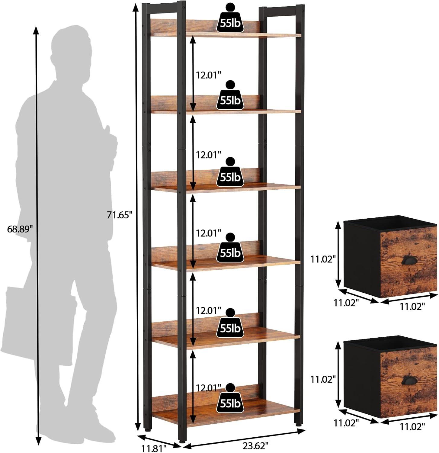 This tall, 6-tier bookshelf instantly elevates any space with its charming rustic brown finish combined with a robust metal frame, perfectly embodying an industrial yet cozy aesthetic. Its sturdy particleboard shelves, each capable of holding up to 55 pounds, create a reliable platform for showcasing books, plants, décor, or family photos. the inclusion of two removable fabric drawers adds a layer of practical storage while blending seamlessly with the overall design, keeping smaller items neatly tucked away yet within easy reach. Its vertical design fits well in bedrooms, living rooms, offices, or even kitchen corners, making it a versatile addition to our home or workspace.