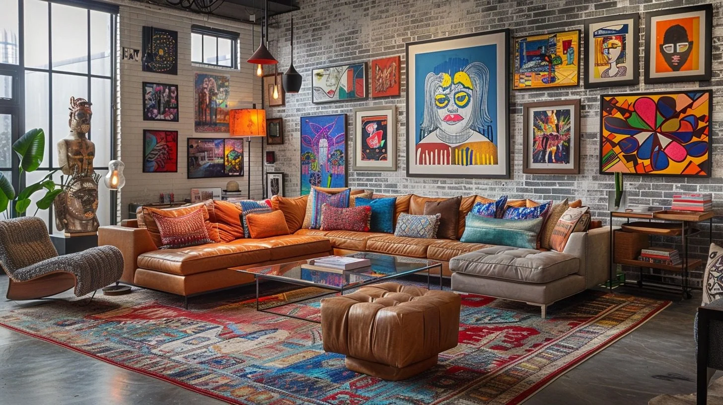 This room dazzles with a fusion of materials and artistic techniques, featuring mosaic tile walls, textured paints, and fabric panels that create a rich sensory experience. Furniture crafted from reclaimed wood and modern metal frames adds to the eclectic charm. It’s an ideal space for creatives who view their home as a canvas for artistic expression.