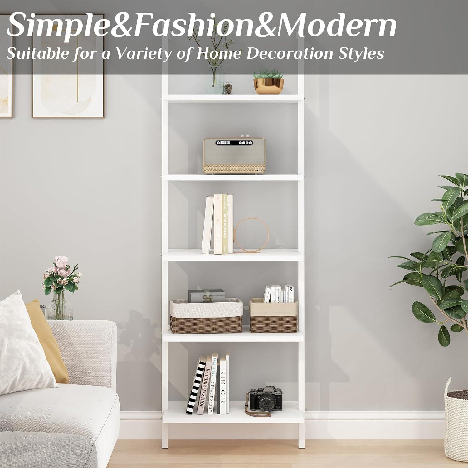 To maximize the charm of this ladder-style shelf, we suggest combining function and aesthetic by mixing various elements across its five spacious tiers. Think beyond just books-incorporate verdant houseplants to bring freshness and a splash of nature indoors, or showcase your favorite art pieces and decorative pottery for a personalized touch. The open design and clean white finish create a neutral backdrop, allowing you to play with colors and textures. For example, alternating stacks of hardcover books with woven baskets can add both warmth and organization to your living room or bedroom.