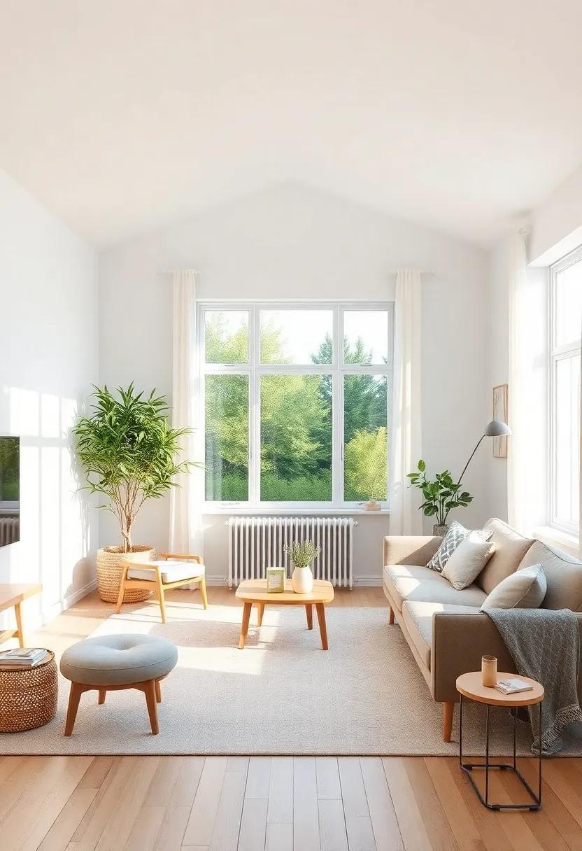 Incorporating large windows into your living room can lead to a harmonious interaction with nature, emphasizing simplicity and functionality crucial to Scandinavian aesthetics. When designing a space that promotes serenity, consider the following elements: