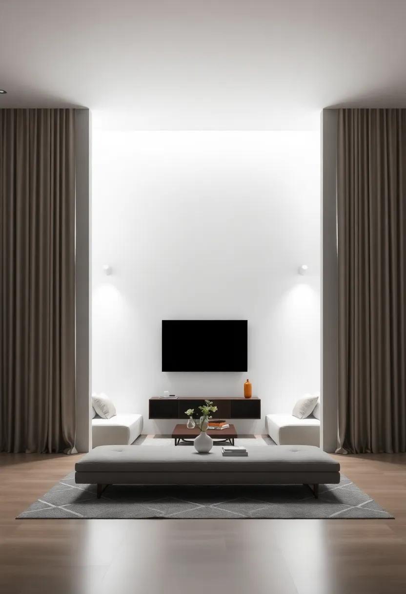 To achieve an inviting and spacious feel in a small contemporary minimalist living room, the use of light and shadow is essential.By strategically layering these elements, you can create visual interest and enhance the room’s dimensions. Start with a neutral palette to reflect light, then introduce various textures through materials such as soft fabrics, sleek metals, and natural woods. Consider the placement of large mirrors to amplify natural light sources, creating the illusion of openness.Utilizing translucent drapes can also gently filter light, casting soft shadows that add depth without overwhelming the simplicity of the space.