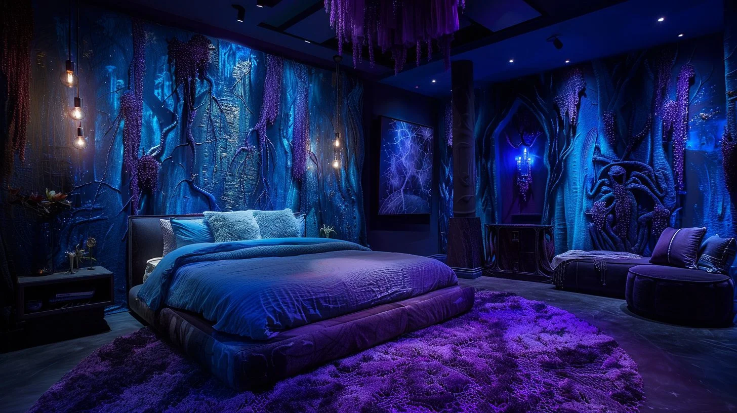 The Abyssal Depths Retreat features deep sea blues and dark coral accents, with decor reminiscent of submerged relics. Soft lighting and ambient ocean sounds enhance the immersive underwater cave sensation. This bedroom is perfect for those intrigued by the mysteries lurking beneath the waves. Find more underwater fantasy ideas here.