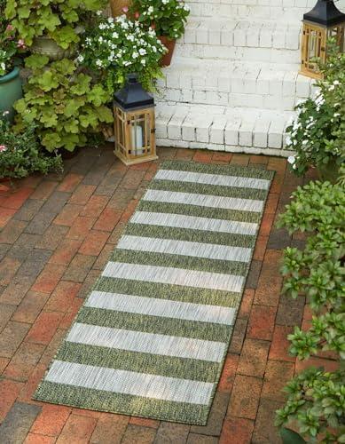 Stylish Outdoor Runner Rug with Distressed Stripe in Green and Gray