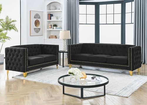 Constructed from high-quality velvet fabric, this modern sofa set boasts an elegant aesthetic and a luxurious feel. Its unique luster enhances any living space, while the high-density sponge seat cushions ensure optimal comfort and support. With a sturdy frame made of solid wood and metal legs designed for longevity, this couch can withstand significant weight—up to 500 lbs for the 2-seater and 750 lbs for the 3-seater. The tufted buttons, nailhead accents, and classic lozenge design contribute to its charm, making it an ideal addition to a living room, bedroom, or office.