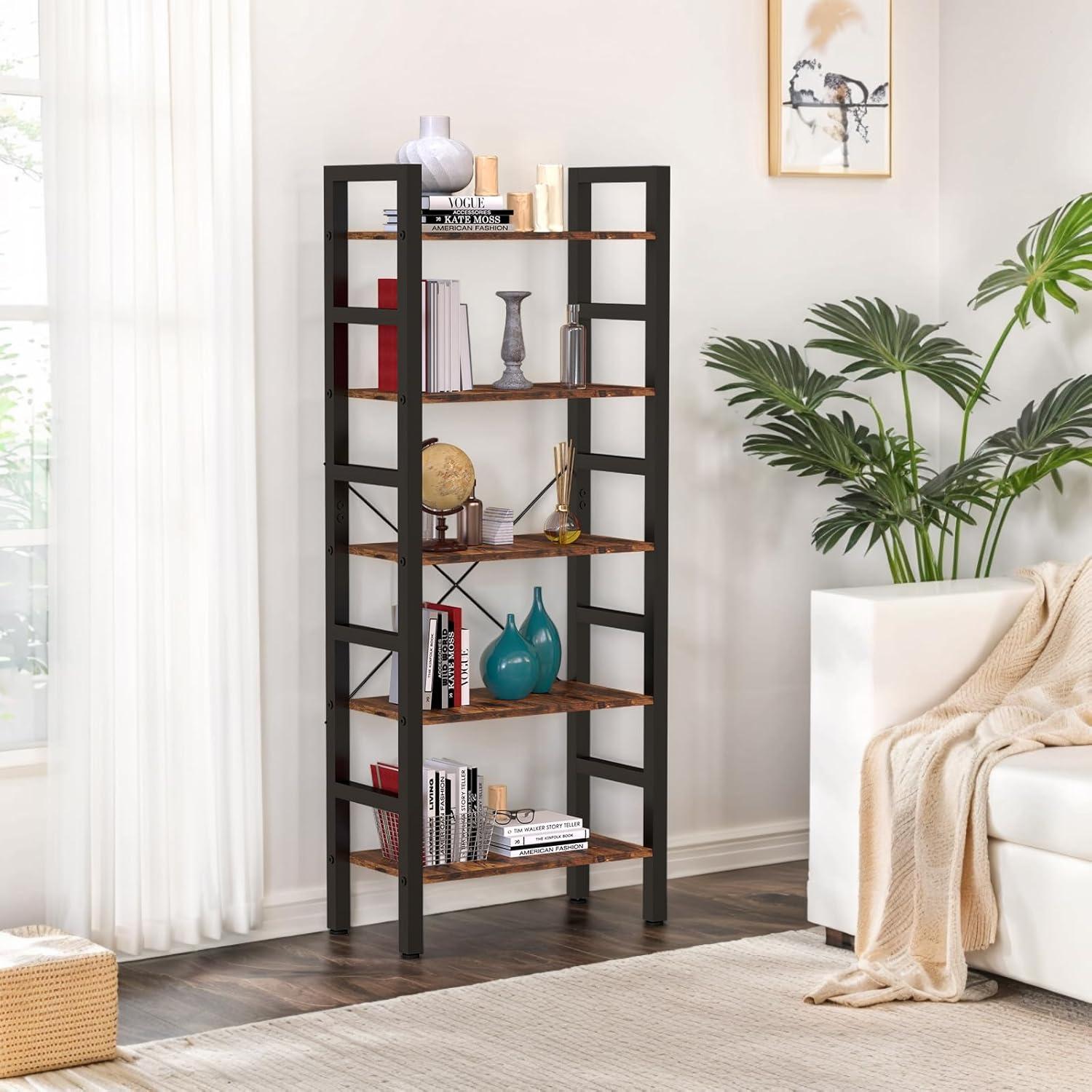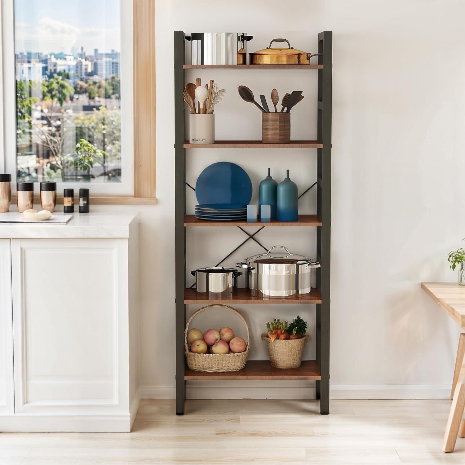 We found that the generous five-tier layout offers remarkable versatility across different spaces in our home. In the living room, the tall shelving unit hosts an eclectic mix of books, potted plants, and decorative pieces without feeling cluttered thanks to its open design and sturdy wood surfaces. Each shelf comfortably holds up to 30 lbs, allowing us to display everything from heavy art books to robust ceramics without any worry. Its vintage-inspired brown wood finish combined with the sleek metal frame elegantly complements our contemporary décor while adding a touch of warmth and character.