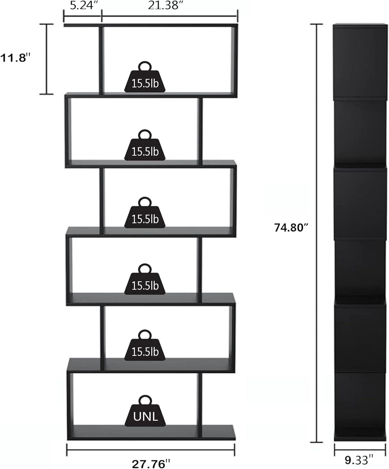 Our experience with this uniquely styled storage unit highlights the perfect blend of function and modern artistry. The S-shaped, six-tier design maximizes vertical space without compromising room aesthetics.Finished in sleek black with a subtle melamine coating, it not only promises durability but also complements a wide range of furniture styles. Whether set upright as a dynamic room divider or laid horizontally to serve as an avant-garde TV stand or wine rack,this bookshelf adapts to our evolving interior needs with surprising versatility. The staggered rectangular compartments add visual interest while increasing load capacity, creating an inviting display for books, photos, or decorative pieces.