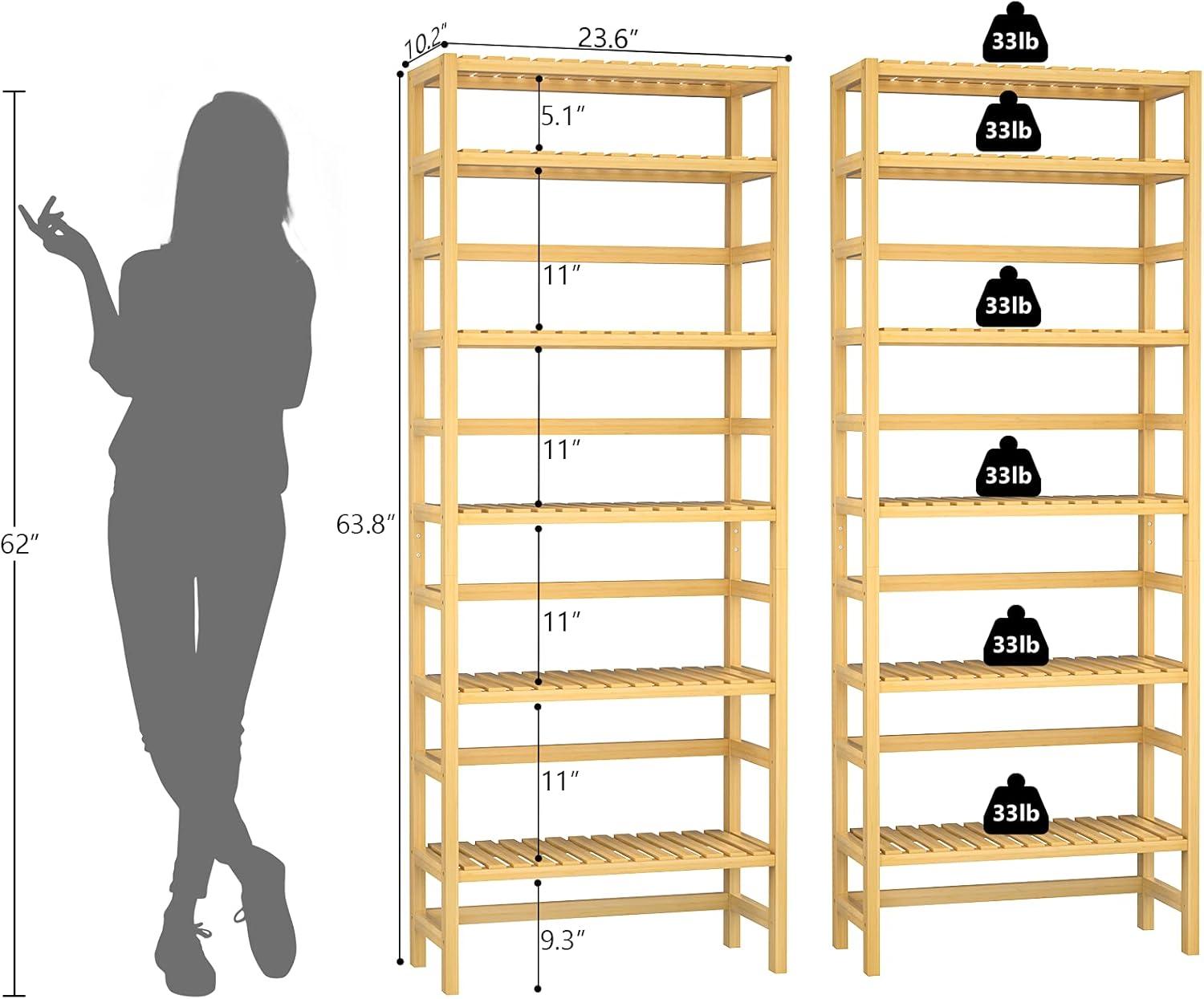 One of the standout features is its ability to fit seamlessly into multiple spaces thanks to its compact footprint of 23.6″L x 10.2″W and height of 63.4″.Whether placed in a living room to display books and cherished photo frames, or in the kitchen to hold spices and decorative baskets, this shelving unit adapts effortlessly. Its six adjustable tiers offer customizable storage heights, allowing us to arrange everything from tall houseplants to neatly folded towels with ease. The natural bamboo finish adds a warm, organic touch that complements both modern and rustic interiors, enhancing any setting without overpowering it.