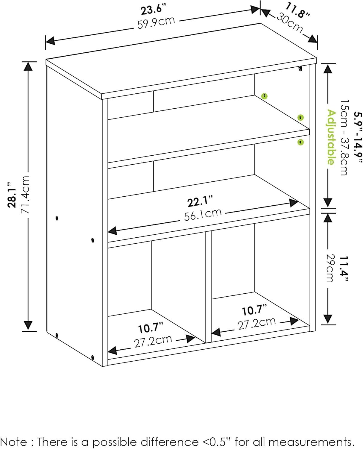 With three tiers designed to maximize vertical space,this bookshelf is a smart solution for organizing a variety of items in compact living areas. The adjustable middle shelf, sliding from 5.9 inches up to 14.9 inches in height, offers remarkable flexibility, allowing us to customize storage for books, photo frames, or decorative pieces with ease. Each of the top two shelves supports up to 15 lbs, while the bottom compartments can hold up to 20 lbs each, providing a dependable foundation for our daily essentials without worrying about stability or sagging.