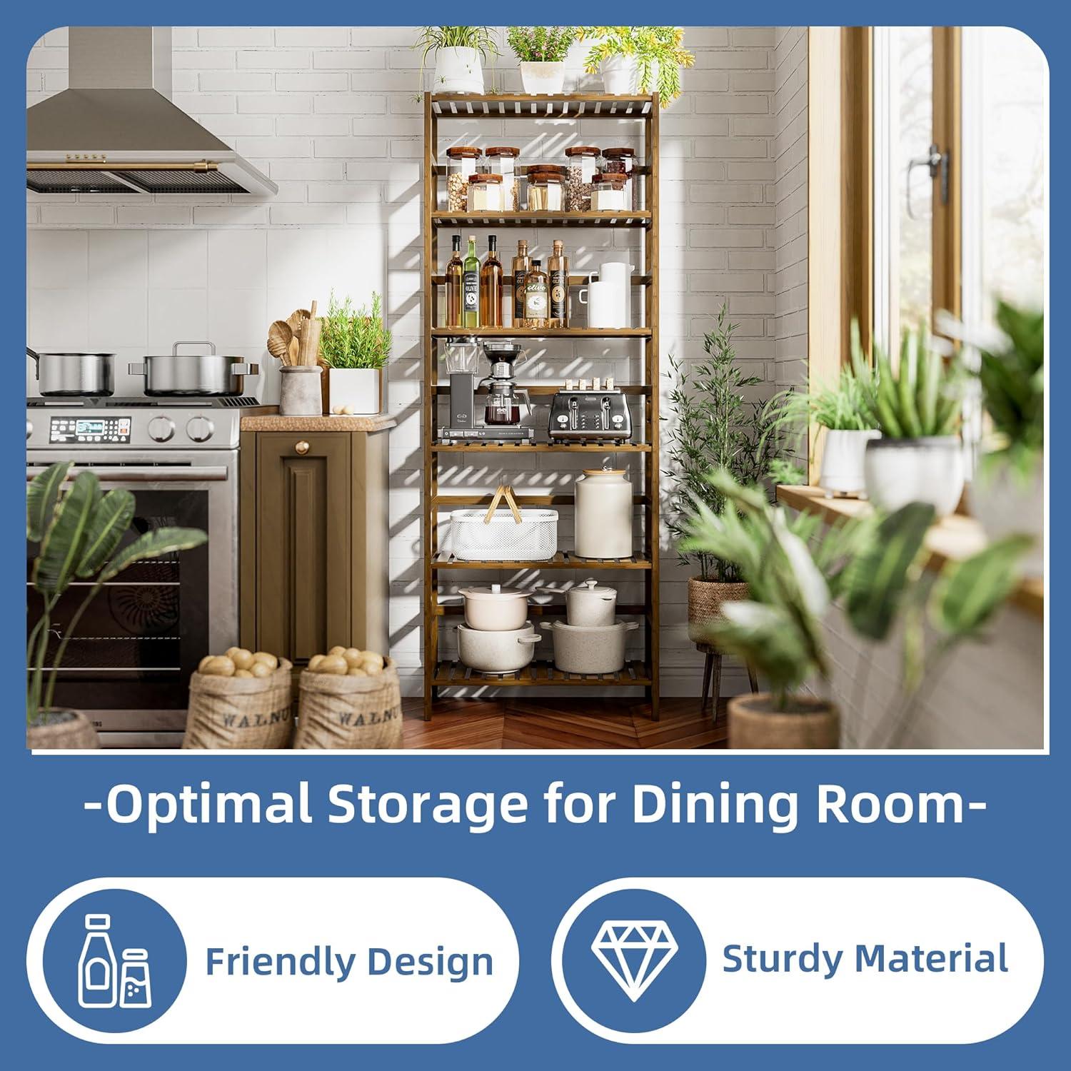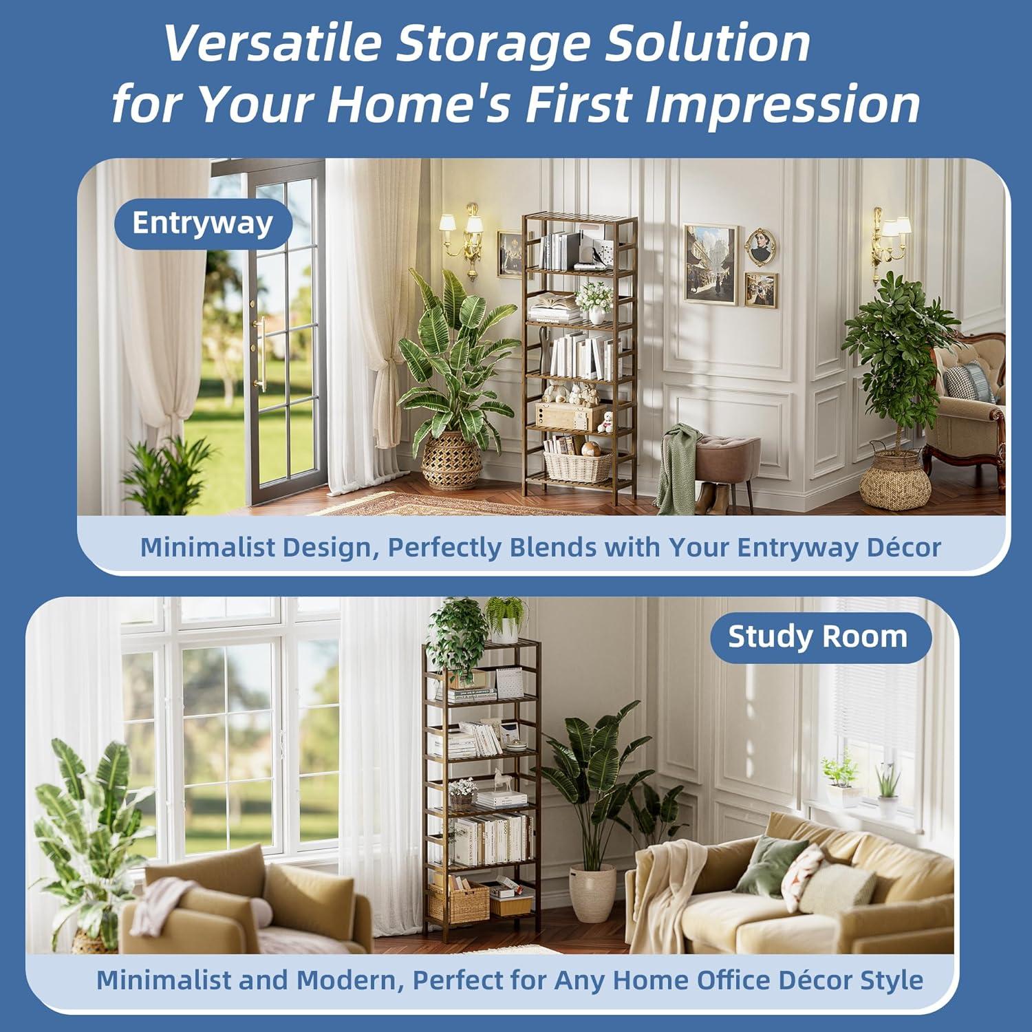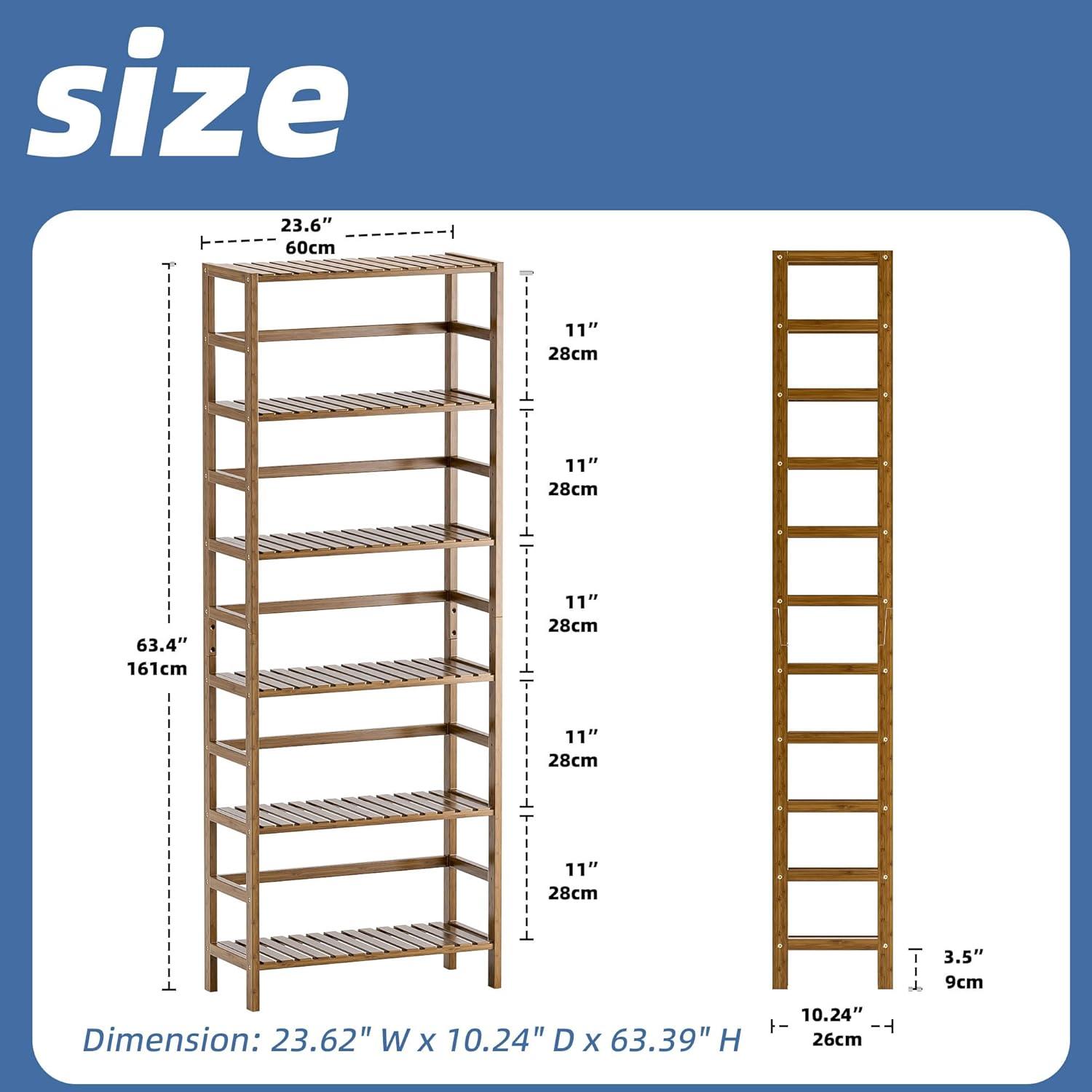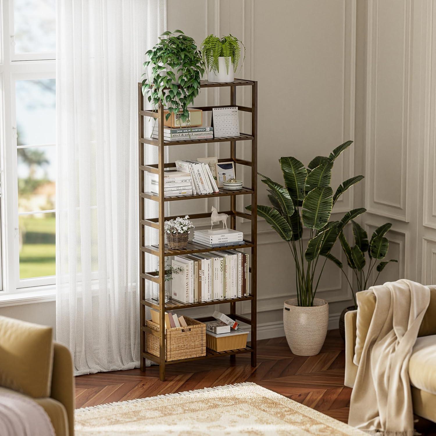 After spending time with this 6-tier bamboo bookshelf, we appreciate its balance of style, function, and stability.The adjustable shelves allow us to customize each tier, accommodating a variety of items from tall plants to books and decorative pieces. its compact footprint makes it an ideal solution for those working with limited space, yet it manages to offer impressive vertical storage.Crafted from solid bamboo with reinforcing crossbars and an included anti-tip kit, it provides a sturdy and safe display that complements multiple room styles thanks to its sleek, minimalist walnut finish.