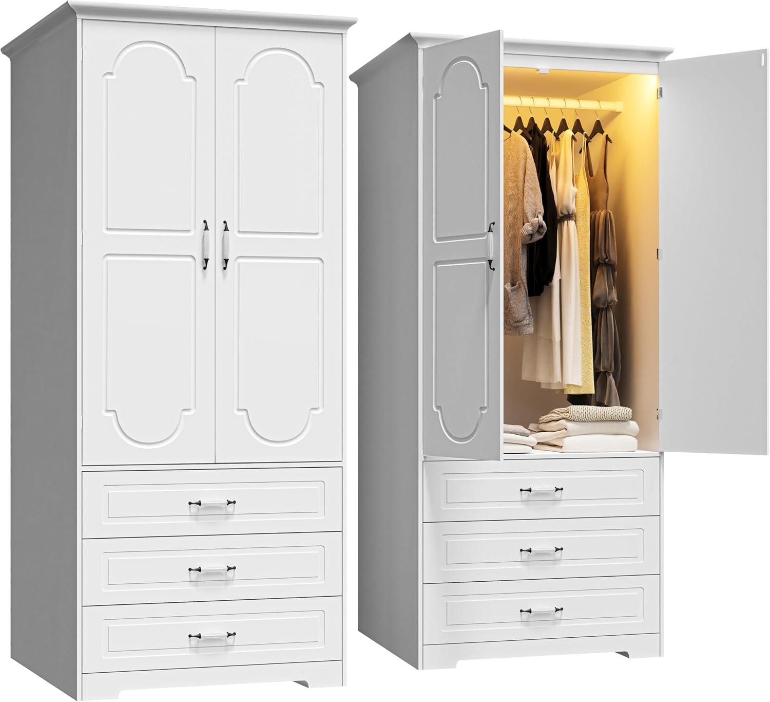 Living with the Wooden Armoire Wardrobe Closet with 3 Drawers and LED Light 72″ Modern Bedroom Armoire with Retro Ceramic Door Handles Wardrobe Cabinet with Removable hanging Rod White, you notice it quiets a corner of the room in small ways over time. In daily routines it finds its role — holding the out-of-season shirt, catching the scuff of a shoulder bag, smoothing into the path you take between bed and window — and those small interactions shape how it feels under your hand and eye. The surfaces collect the soft evidence of use, the door closes with the same familiar give, and its presence gradually becomes part of regular household rhythms. After a while it simply stays.