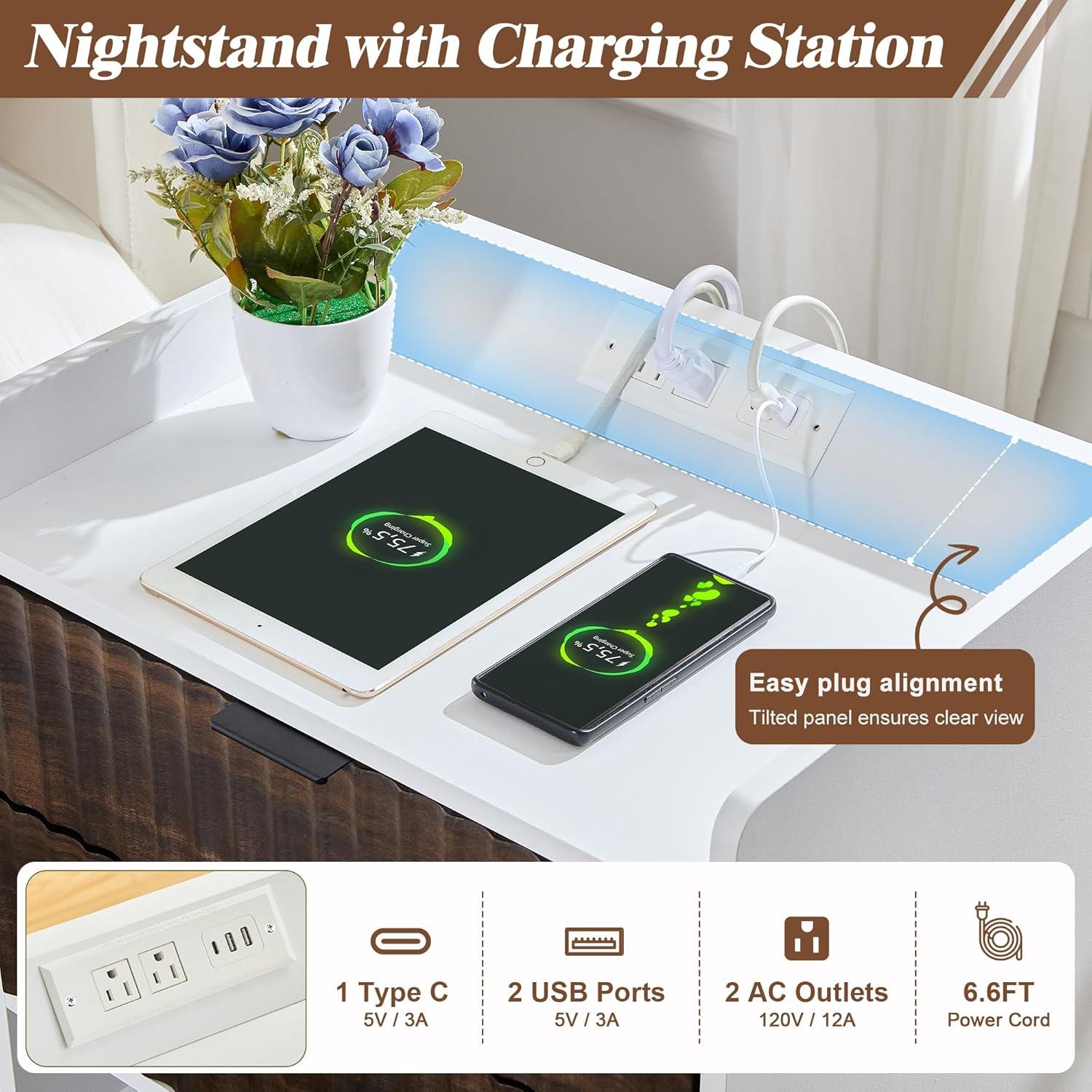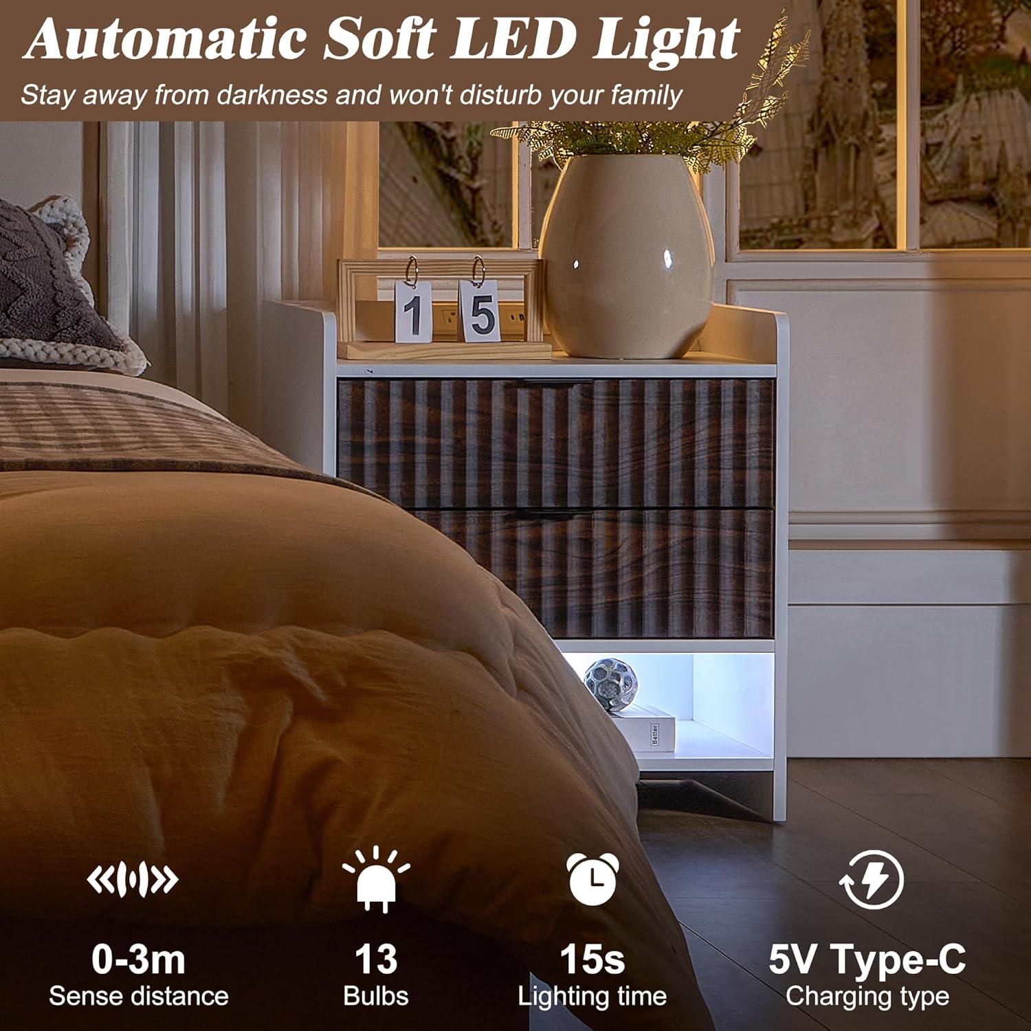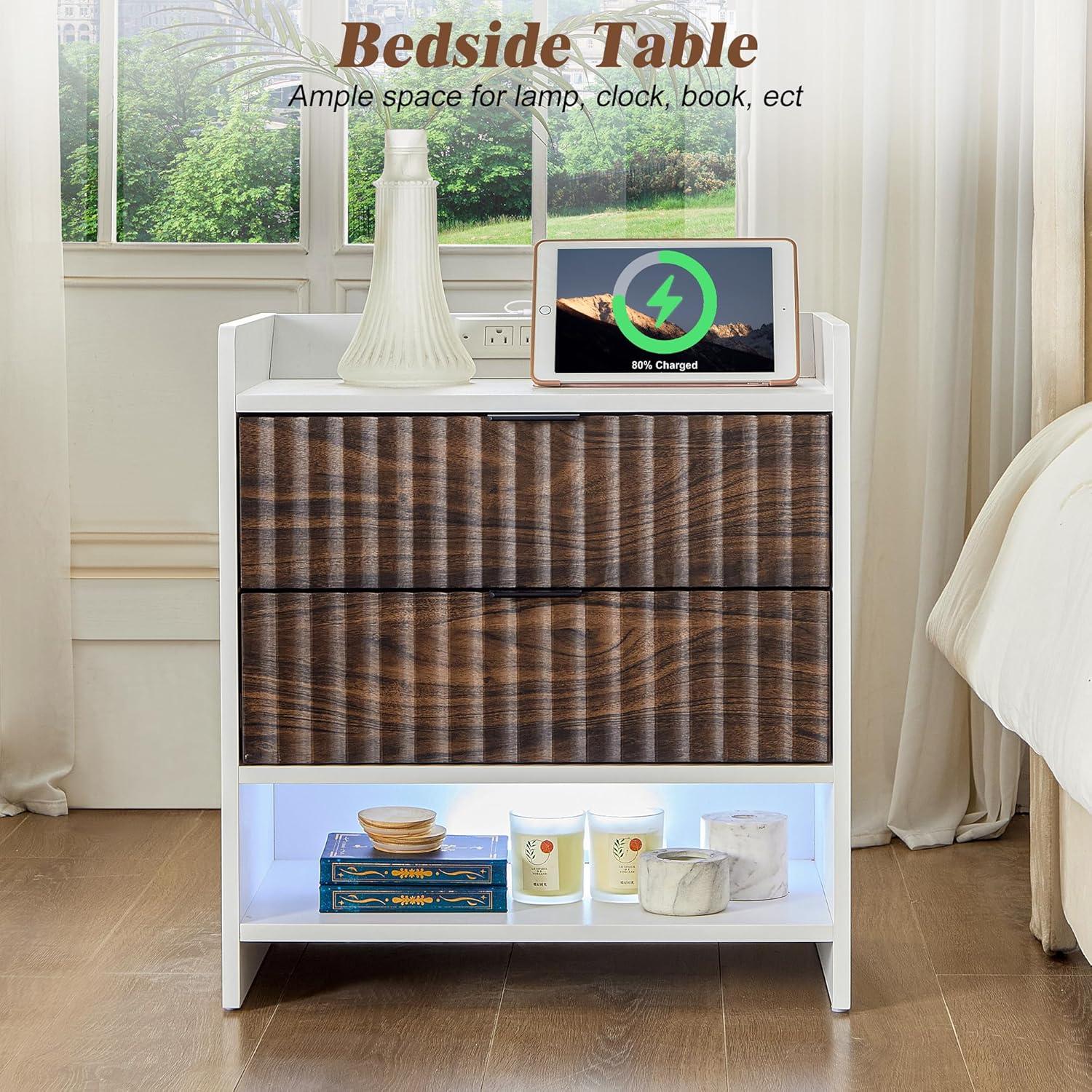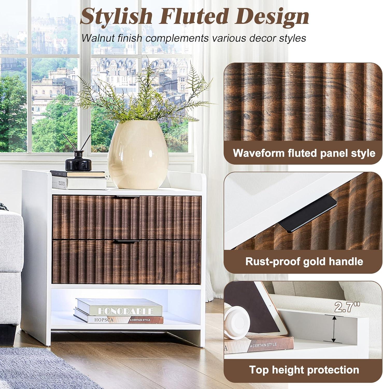 Living with the Fluted Night Stand with Charging Station, Farmhouse Nightstand with LED Light, Modern Bedside Table End Table with storage shelf, 2 drawer Dresser with outlet, USB, Type-C Port, White&Brown feels less like an experiment than a quiet folding into your evening habits. You notice the lower shelf becoming the usual place for the book you return to, the drawers answering with a soft, familiar give, and the top gathering faint rings and the tiny marks of ordinary use. In daily routines it takes on a steady presence at the edge of the bed, an unassuming companion to coming and going. Over time you find it stays.
