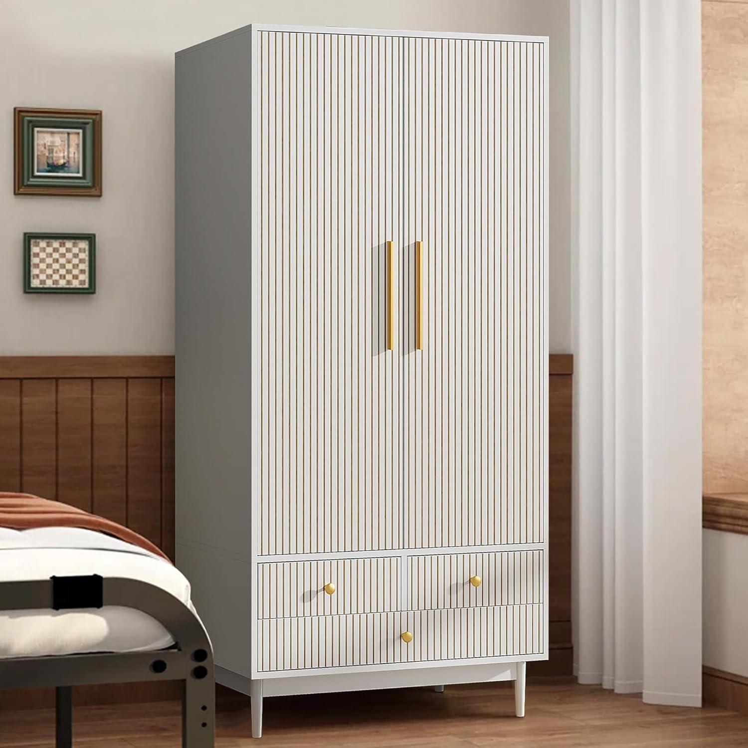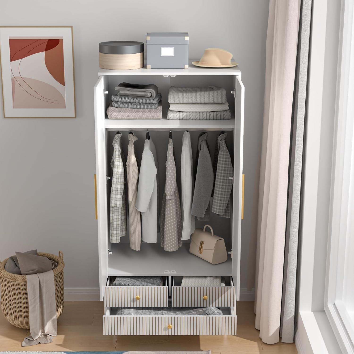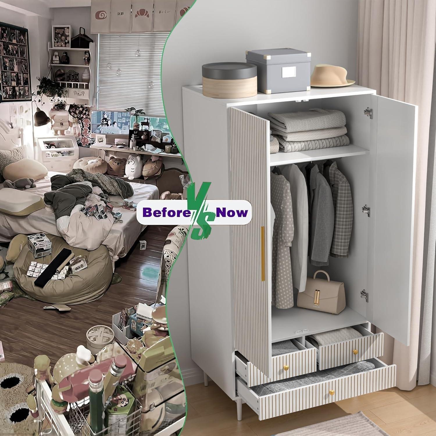 After living with the Armoire ​Wardrobe Closet with Drawers and 2 Fluted Doors 64.96 in Farmhouse Closet Wardrobe Cabinet with hanging Rod Freestanding wooden Bedroom​ Armoire Storage⁢ Cabinet with Shelf (White), you see how ‌it eases into the room‌ over time, folding ‌into the ⁢patterns of morning and night. In daily routines it quietly shapes how you move through the space and ⁢how you reach for things, a ‍steadying presence in small, repeated gestures. The surfaces gather the soft evidence of use — a faint scuff here, a thumb-worn edge there⁤ — and ⁤that wear becomes⁢ part ‍of the comfort ‌of the place.‌ You notice, without⁤ fuss, that ​it‌ stays.