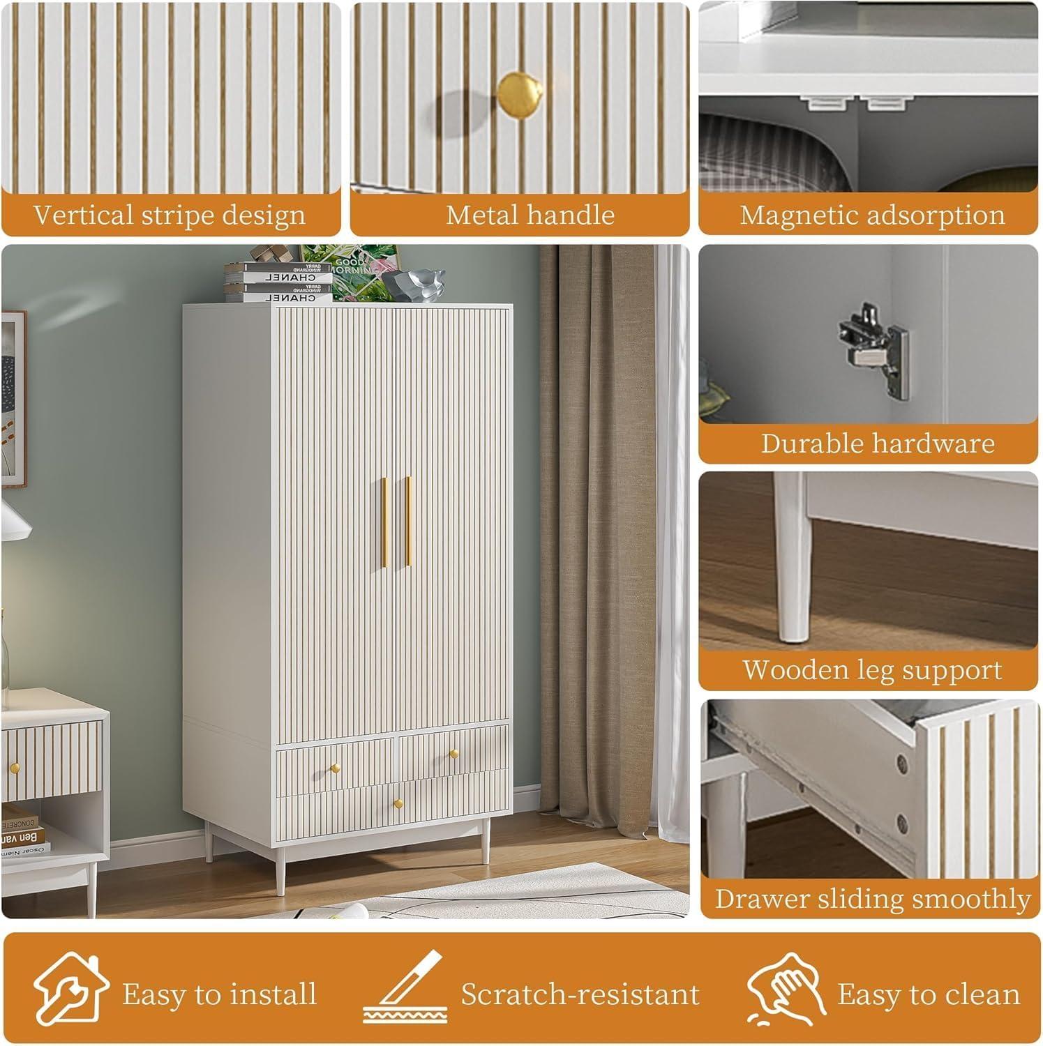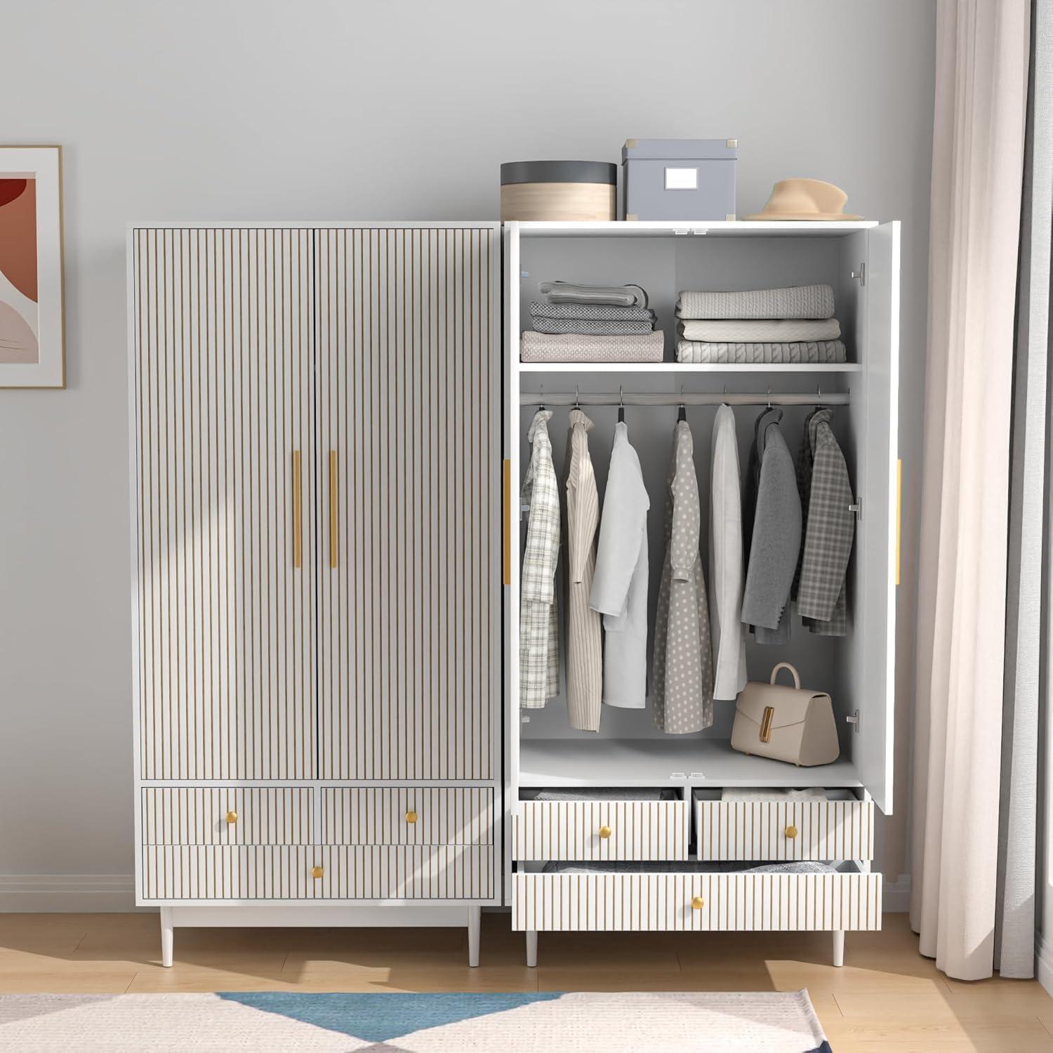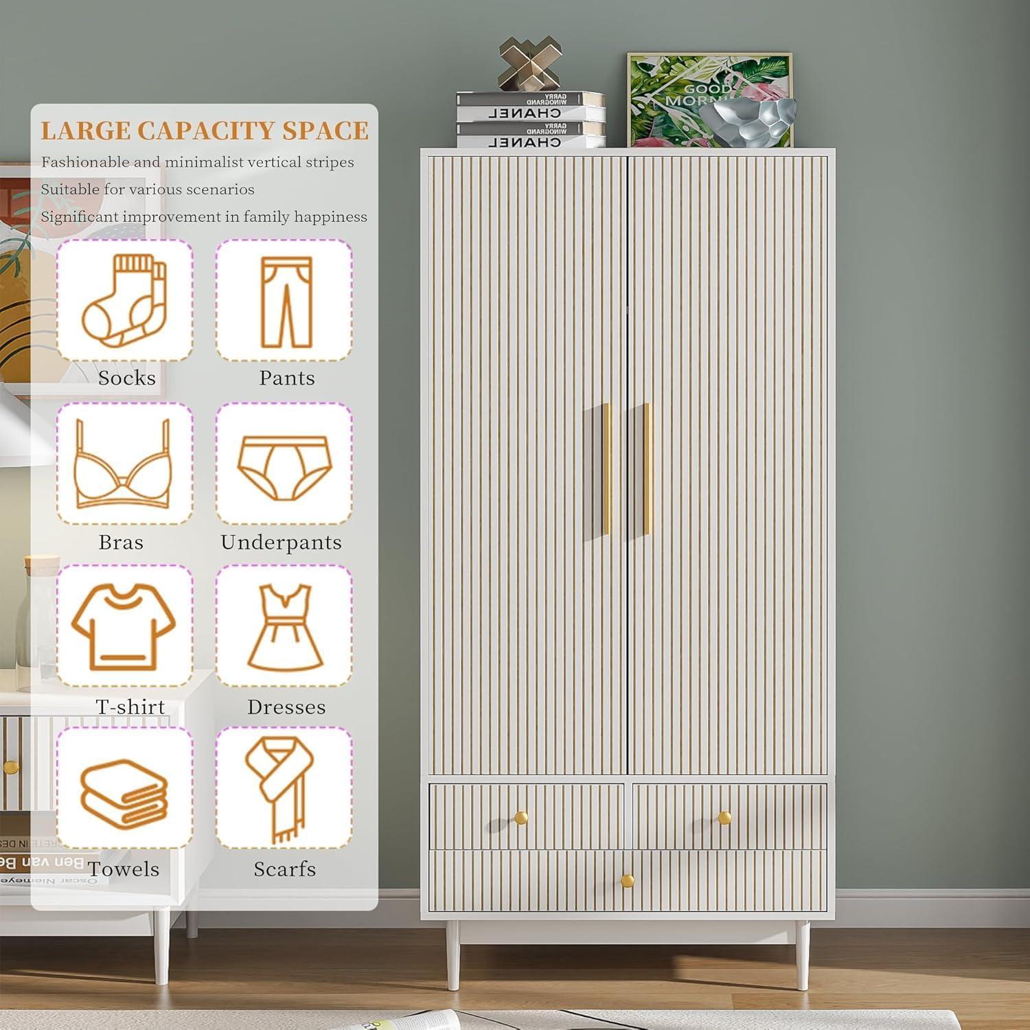 After living with the Armoire ​Wardrobe Closet with Drawers and 2 Fluted Doors 64.96 in Farmhouse Closet Wardrobe Cabinet with hanging Rod Freestanding wooden Bedroom​ Armoire Storage⁢ Cabinet with Shelf (White), you see how ‌it eases into the room‌ over time, folding ‌into the ⁢patterns of morning and night. In daily routines it quietly shapes how you move through the space and ⁢how you reach for things, a ‍steadying presence in small, repeated gestures. The surfaces gather the soft evidence of use — a faint scuff here, a thumb-worn edge there⁤ — and ⁤that wear becomes⁢ part ‍of the comfort ‌of the place.‌ You notice, without⁤ fuss, that ​it‌ stays.
