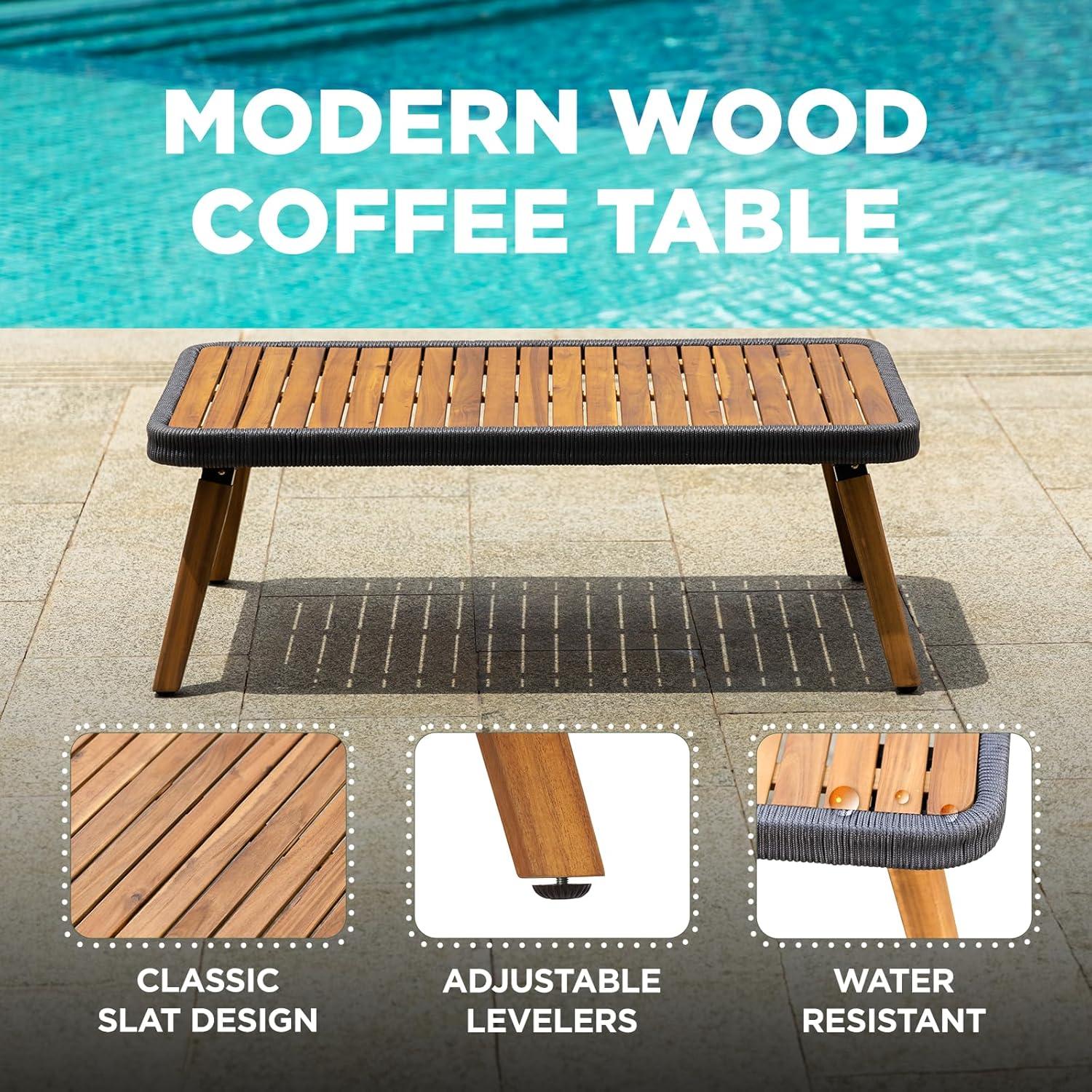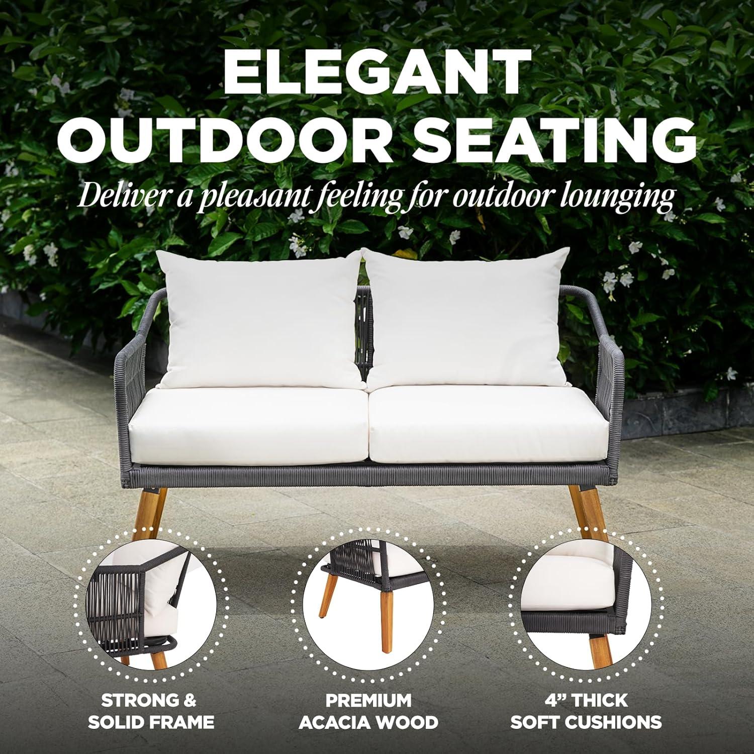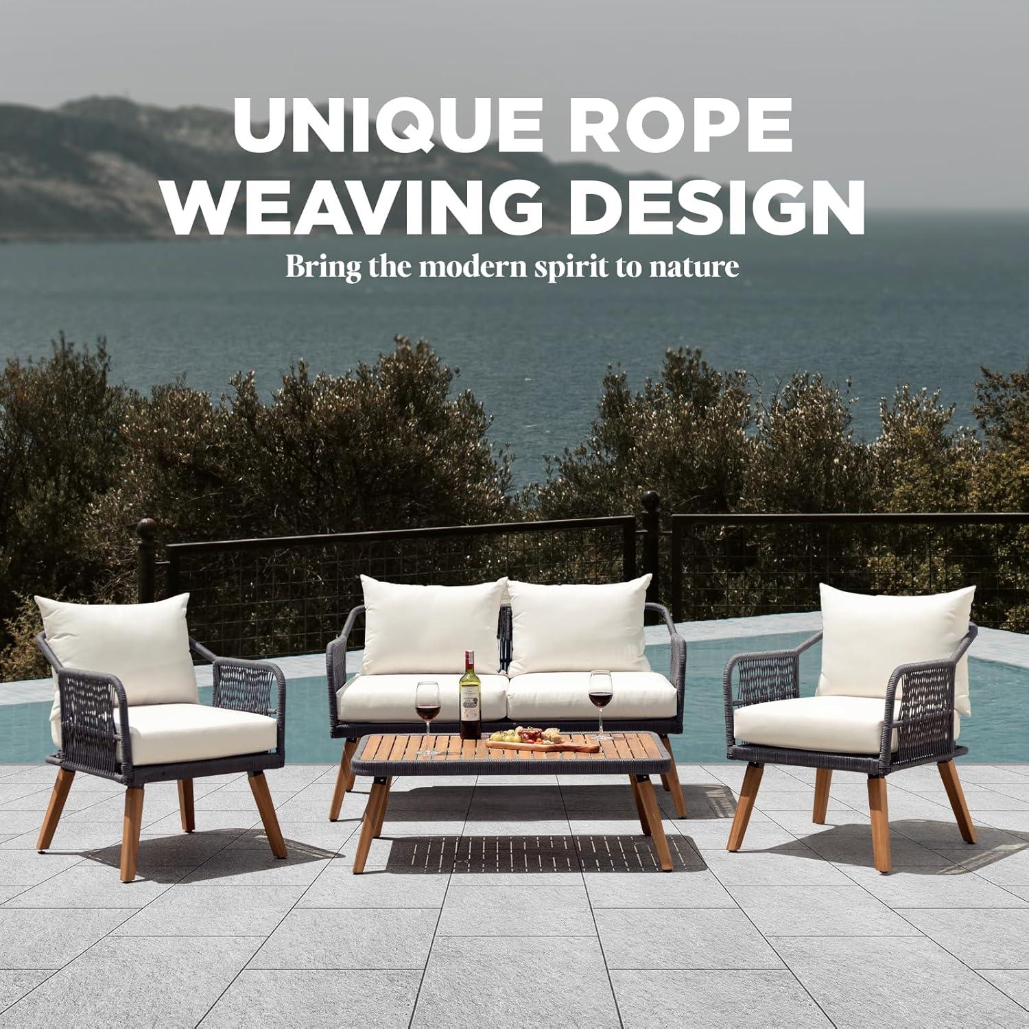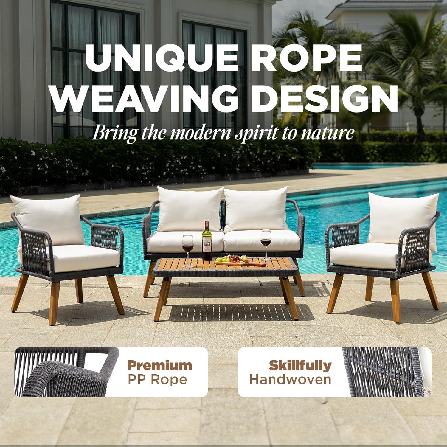 Setting up this elegant four-piece set is straightforward and designed to create a welcoming outdoor conversation area.The arrangement includes a loveseat, two spacious club chairs, and a modern coffee table – each crafted with sturdy FSC-certified acacia wood combined with smooth, handwoven PP rope accents. The loveseat can comfortably support up to 800 lbs, while each club chair supports 500 lbs, ensuring solid durability without sacrificing style. The combination of thick 3.9-inch cushions and solid construction makes it effortless to position each piece for both comfort and easy interaction among guests.