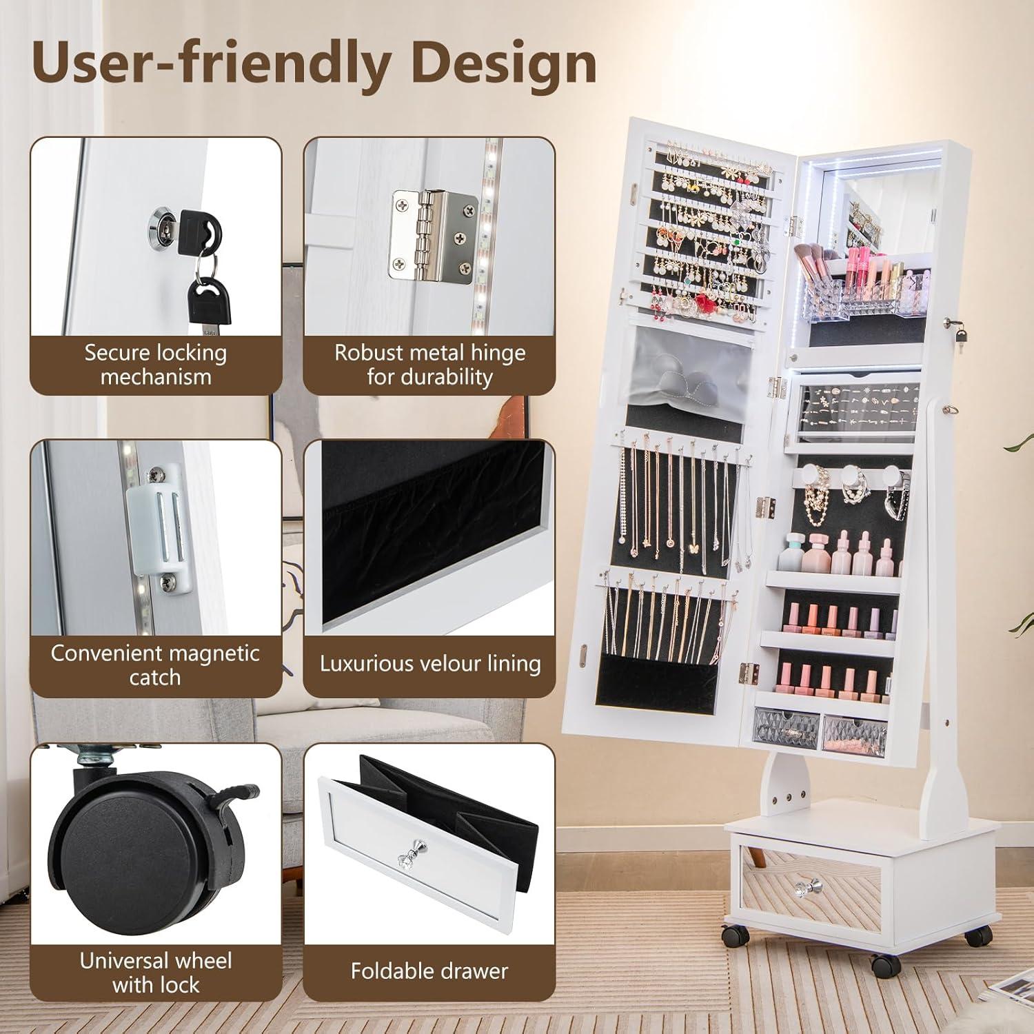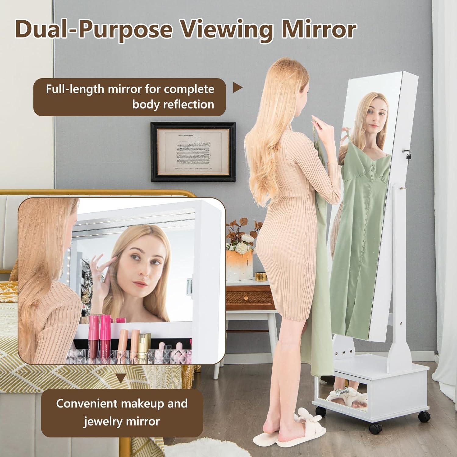 Over time you notice how the GOFLAME Standing Jewelry cabinet armoire with Wheels, Lockable Jewelry Storage Organizer with full Length Mirror, 3-Color LED Lights, Interior Makeup Mirror, Jewelry Armoire for Bedroom (White) settles into the corner, folding into the room’s quiet movements. In daily routines you reach for pieces with a kind of muscle memory, doors and drawers finding a familiar beat while the surfaces pick up soft, ordinary marks. It figures into morning dressing and evening unpacking, quietly shaping how the space is used and how the room breathes through regular household rhythms. After a while it simply stays.