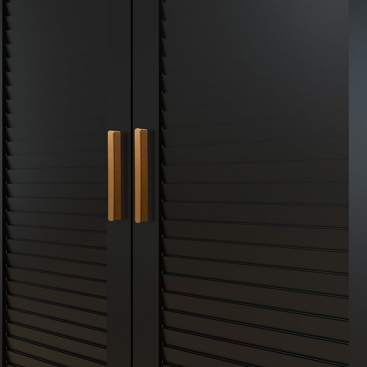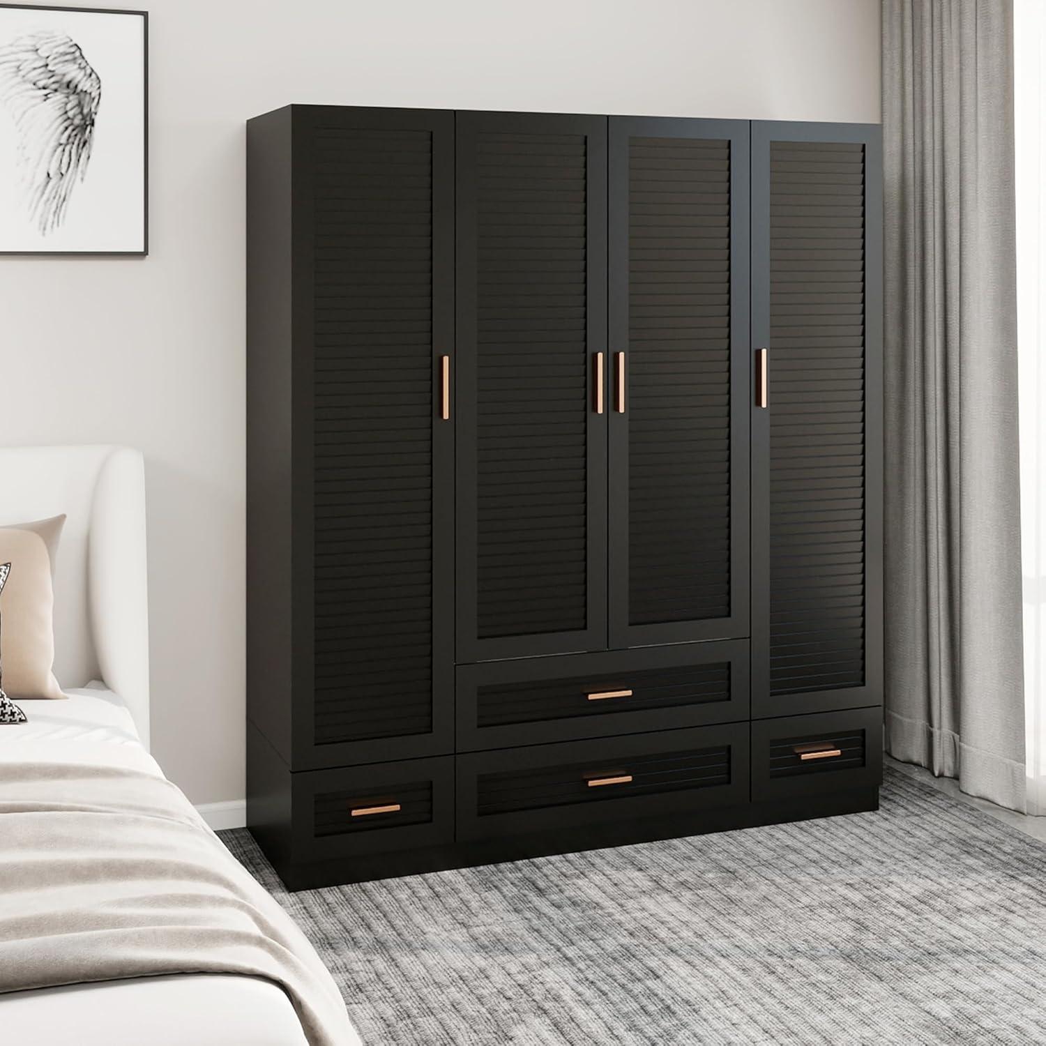 We appreciate the seamless blend of style and functionality this piece offers. Its solid wood construction and precise craftsmanship promise durability, making it a long-term investment for any bedroom. The well-thought-out design includes ample storage with four doors, spacious drawers, and a robust hanging rod – perfect for keeping clothing and accessories meticulously organized. The quiet, smooth-sliding doors add a subtle touch of refinement, keeping the room serene while offering easy access. Assembly is straightforward with clear instructions, but having two people to set it up ensures maximum stability.The elegant black finish and modern lines mean this wardrobe will complement a variety of interior styles, adding a polished and sophisticated feel.