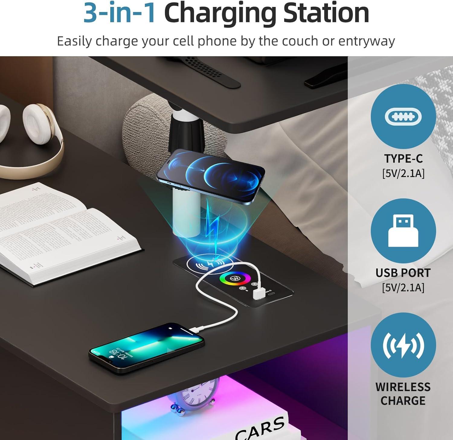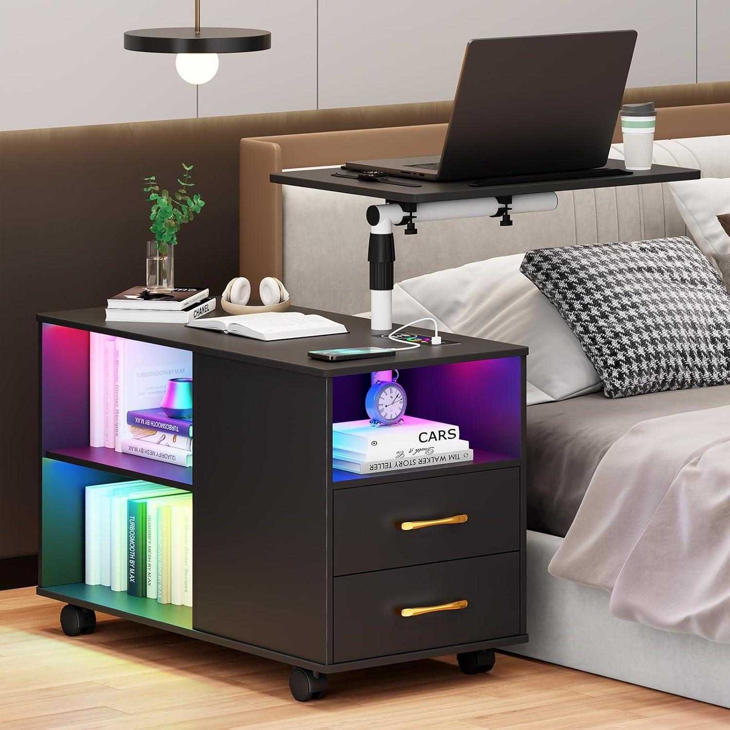 when you roll the nightstand into place beside your bed, the first thing you notice is how it occupies the small gap between mattress and floor — not just as a surface but as an active bedside presence. The top surface sits at a height that lets you set a phone or a book without leaning forward much; the edge of the tabletop comes into view as you lie down, and the LED strip around the perimeter casts a soft halo when it’s activated. Move your hand to reach for the lamp or your phone and the light tends to come on before you fully sit up, a speedy flicker of illumination that makes routines like grabbing glasses or checking the time feel a bit less disruptive to a quite room.
