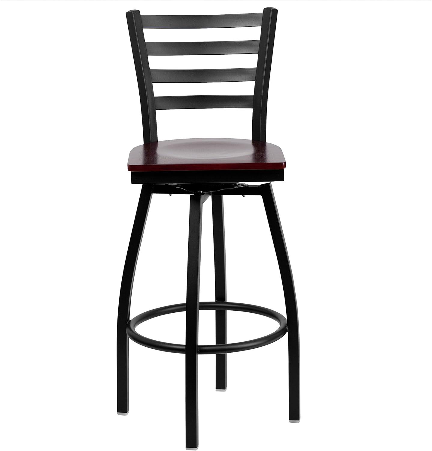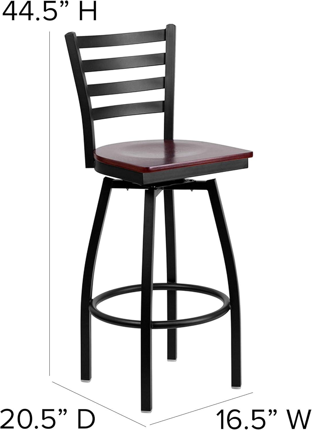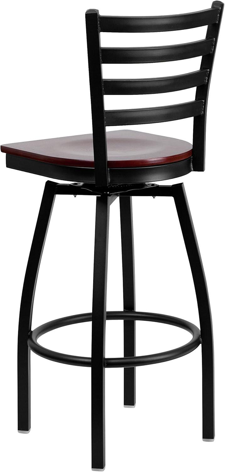 Its sleek black metal frame combined with the warm mahogany seat creates a versatile piece that seamlessly complements both modern and customary interiors. The ladder back design adds a touch of vintage charm, making it a perfect fit for rustic kitchen islands or farmhouse dining areas, while the smooth swivel function introduces contemporary convenience for everyday use. Because it’s crafted from durable materials and finished with protective glides, it blends functionality with style, adapting effortlessly to commercial settings like bars or cafés, as well as residential spaces seeking a balance between rugged durability and inviting comfort.