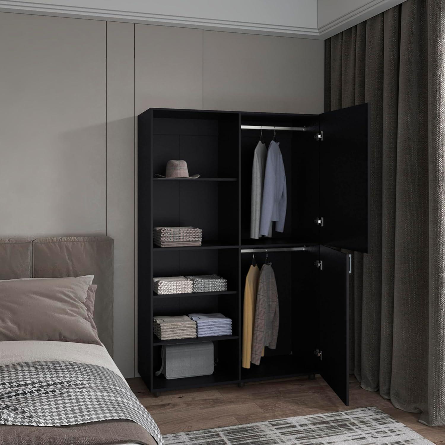 In daily use, the two-door design proved to be incredibly practical. The hanging rod offers quick and easy access to frequently worn outfits, while the hidden shelves keep smaller items organized and out of sight.The black wengue finish enhances the modern aesthetic of our room without overwhelming the décor. Here’s a quick look at what worked well for us: