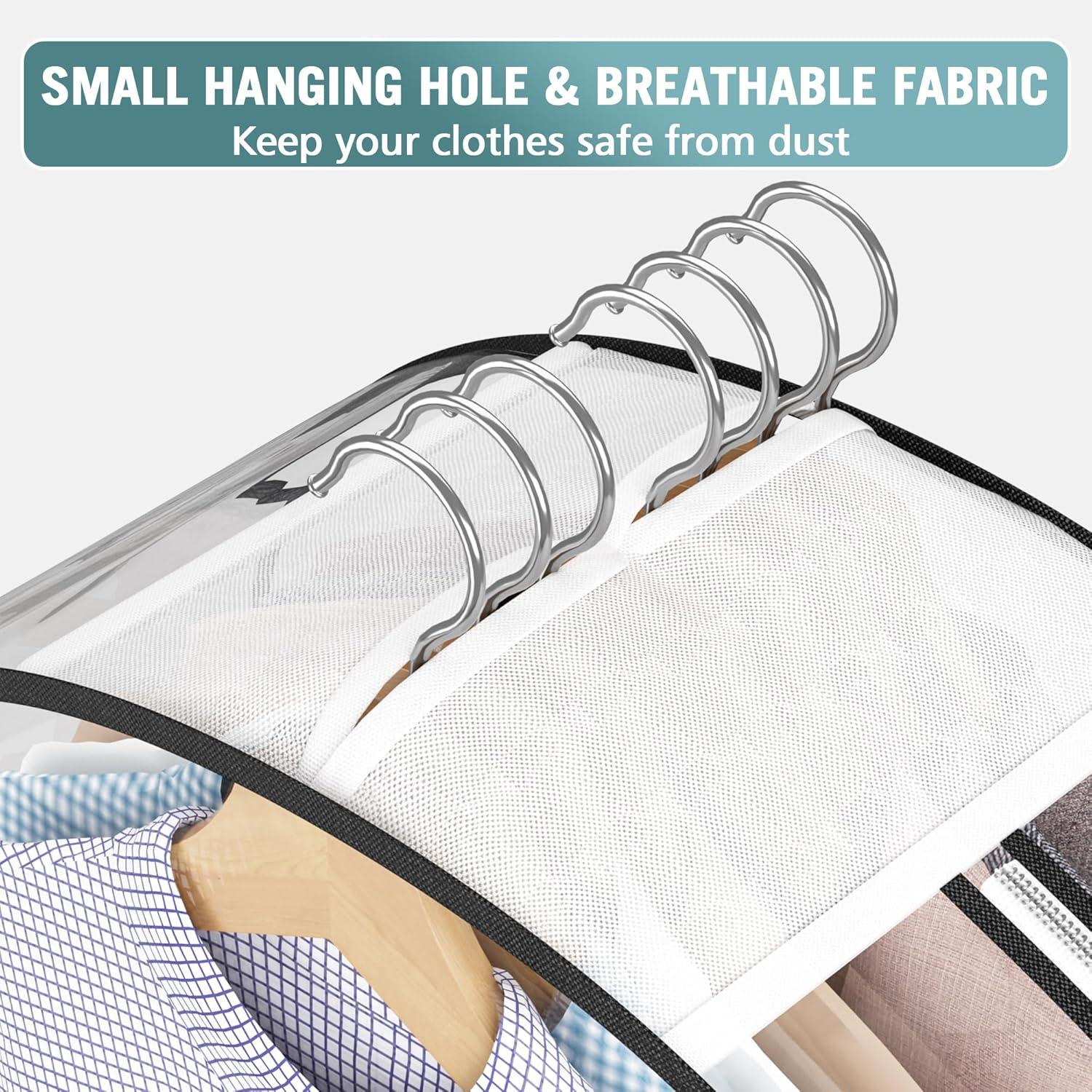 After testing these garment bags extensively, we found them to be an excellent solution for maintaining order and protecting our wardrobe essentials. The transparent design gives us immediate visibility,eliminating the frustrating guessing game and unnecessary handling of multiple pieces.Thanks to the generous 10″ gusset, even bulkier items like thick coats or fur jackets fit comfortably without losing their shape. The smooth side zipper stands out as a thoughtful feature, enabling quick access to any garment without disrupting the rest.Plus, the small hanging holes paired with breathable fabric at the top ensures dust stays out while allowing air circulation, keeping clothes fresh and odor-free.