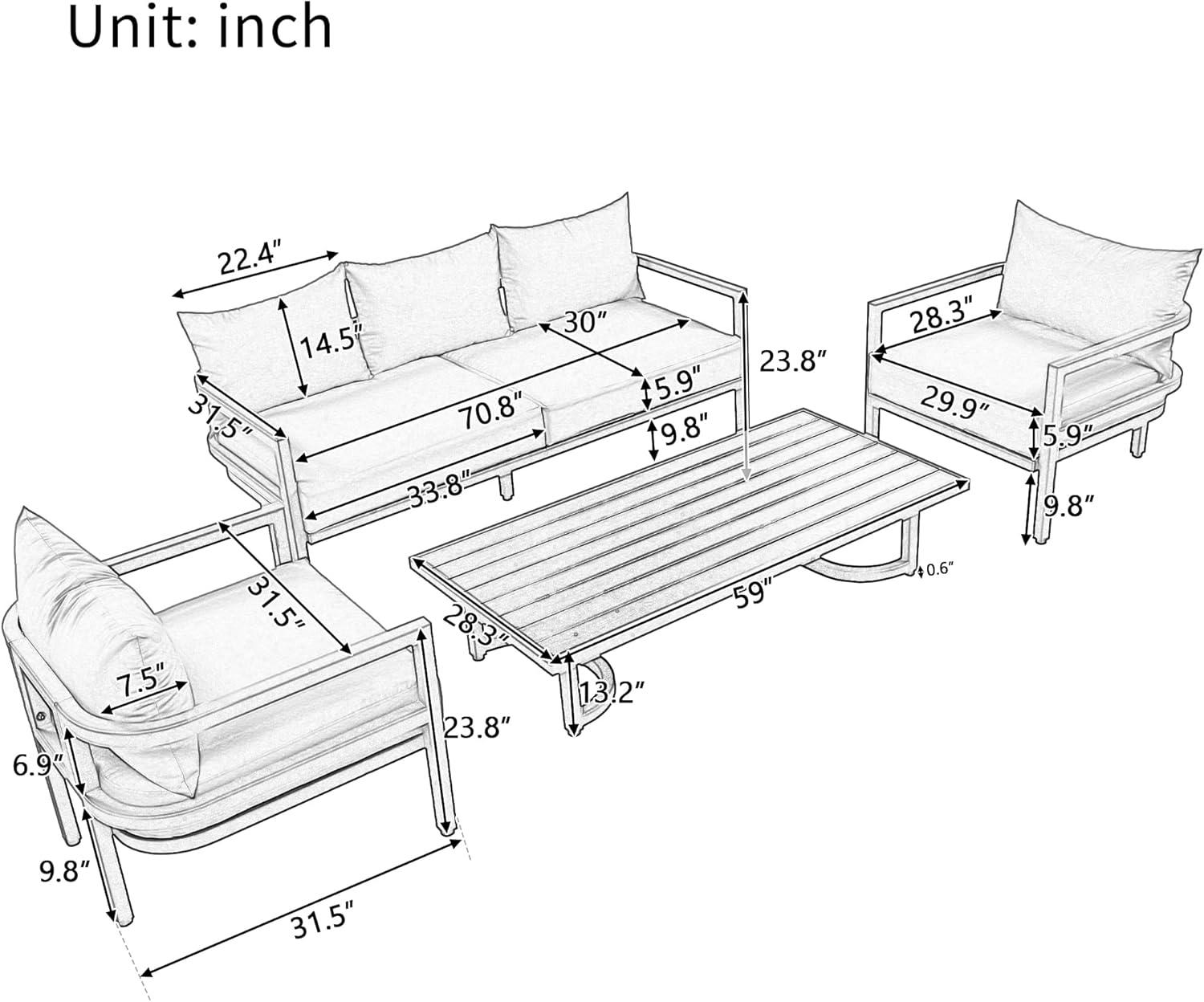 Additionally, the set’s durable powder-coated steel construction and waterproof cushions make it a perfect fit for outdoor environments where weather conditions can vary. The generous coffee table surface, measuring just under 5 feet wide, serves as a practical centerpiece for drinks or décor, but also requires adequate clearance for ease of use. Below is a quick reference table to help visualize spatial needs and dimensions, which we found quite helpful when determining placement in different outdoor settings:
