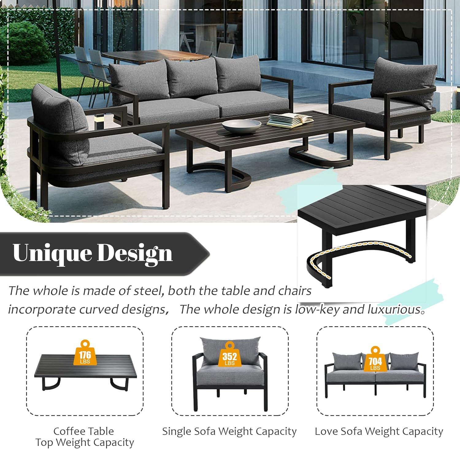The sectional impresses with a striking balance between modern aesthetics and robust craftsmanship. Its clean-lined powder-coated steel frame not only offers a sleek, contemporary look but also ensures remarkable durability against rust and corrosion-making it ideal for all-season outdoor use. The gentle curve of the loveseat and chairs adds a subtle elegance that elevates the overall design,inviting relaxation while creating a sophisticated gathering spot. Complemented by natural acacia wood accents on the spacious coffee table, the set seamlessly blends industrial strength with warm, organic textures, perfect for enhancing any patio, deck, or garden ambiance.