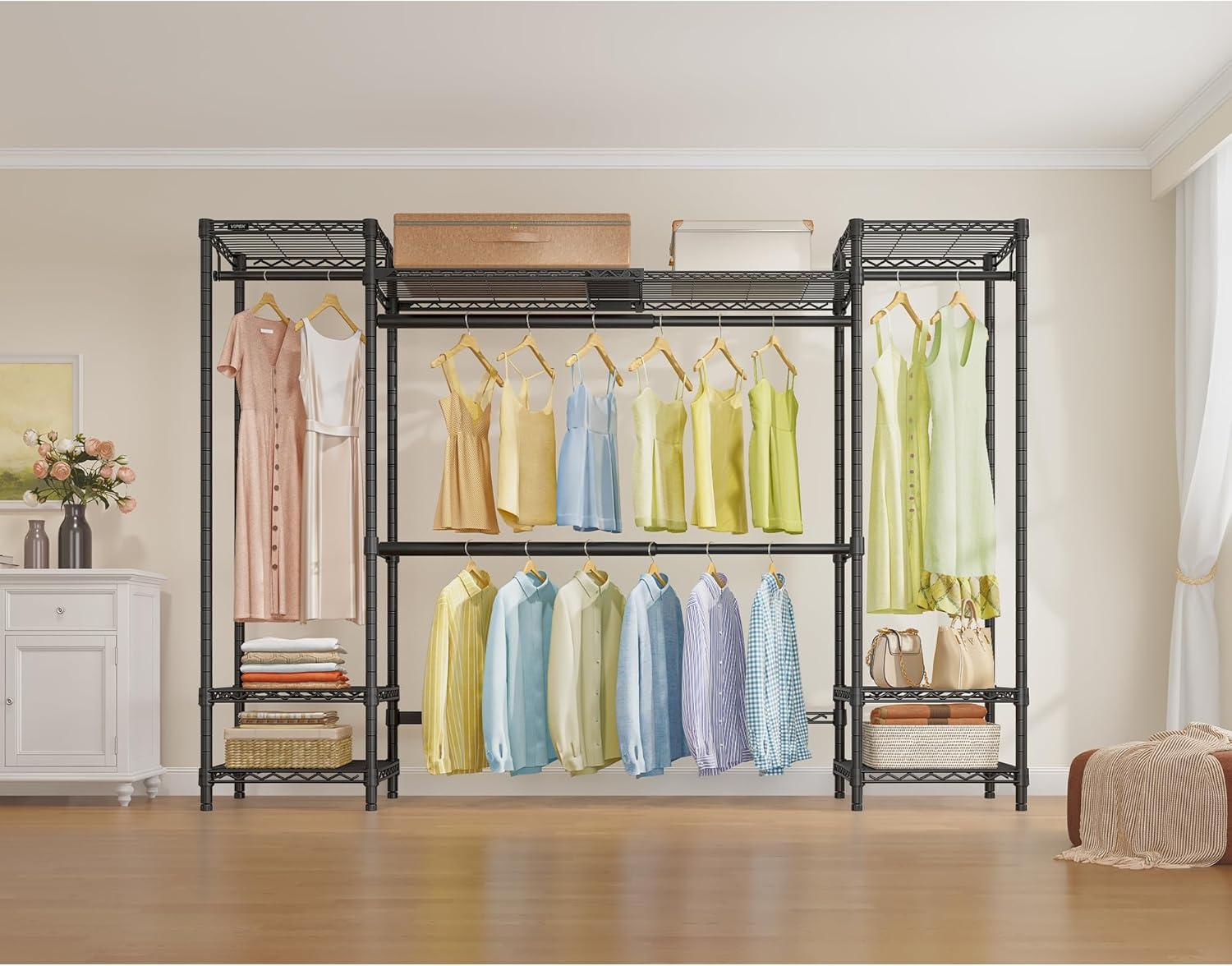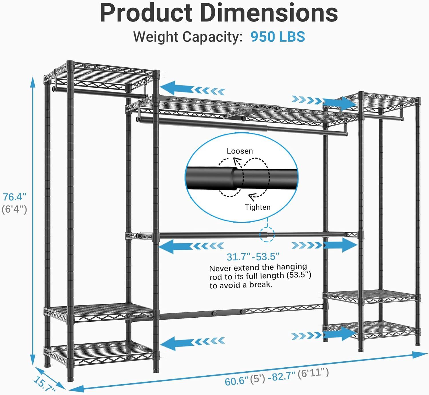 This expandable clothes rack stands out for its remarkable adjustability and capacity.Designed to extend from 5 feet to nearly 7 feet, it offers customizable storage that fits perfectly into a variety of closet spaces, whether walk-in or built-in. Featuring four sturdy hanger rods and seven wire shelves, it accommodates a large wardrobe as well as accessories like shoes, bags, and hats. With a weight capacity of up to 950 pounds, this system is built to support even the heaviest loads without compromising stability.