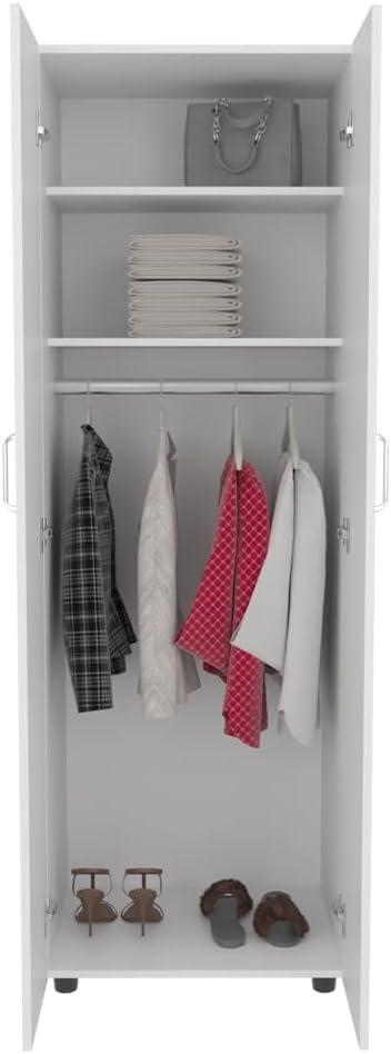 | Modern white finish fits various décors | Width restricts hanging bulky garments |