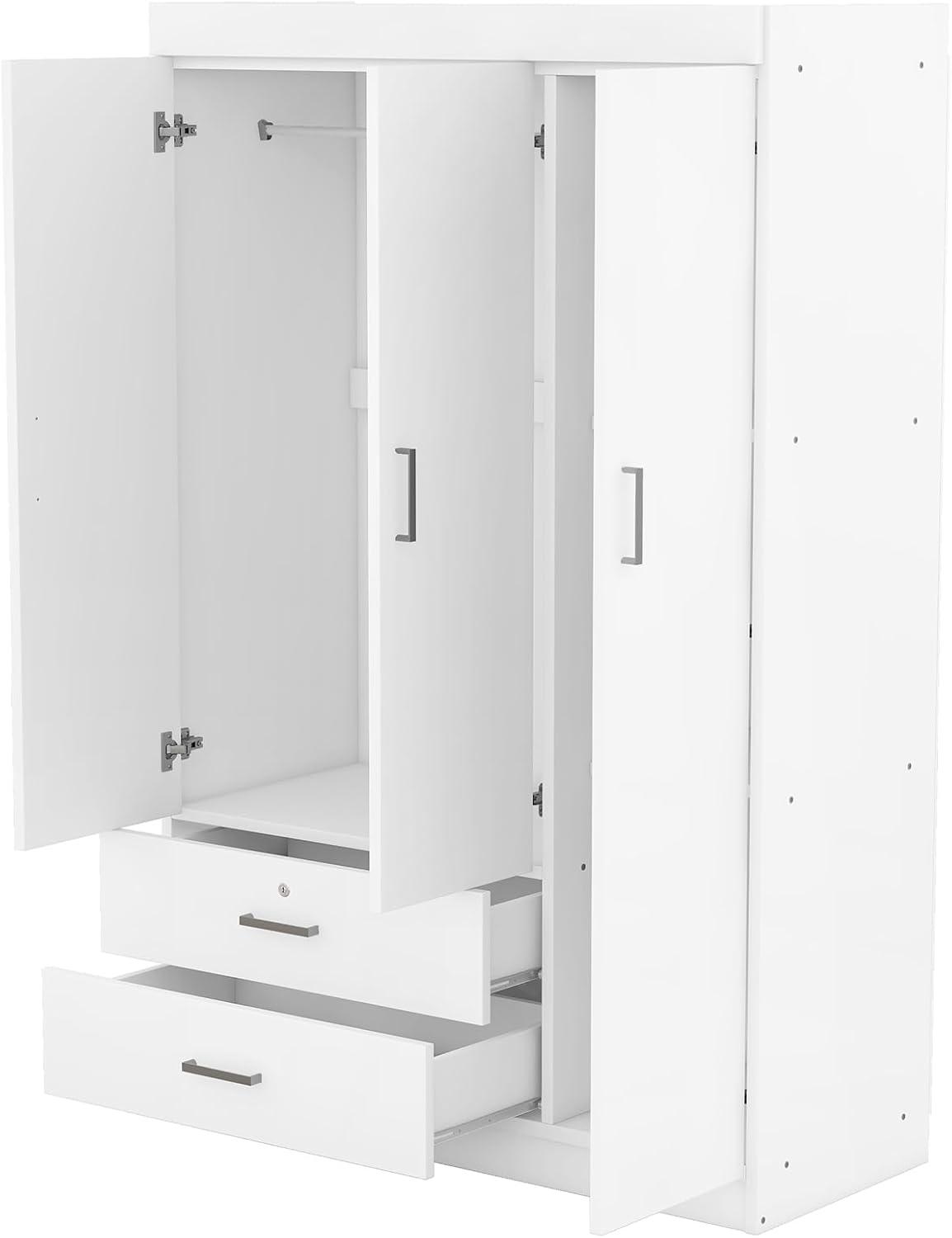 When placing this armoire side by side with other freestanding wardrobes featuring three doors, it stands out for its thoughtful storage layout. The combination of two drawers and a hanging rod allows for versatile organization, accommodating a variety of clothing types without overcrowding.While standard models often provide shelving or just hanging space, this unit’s lockable top drawer adds a layer of privacy and security that many comparable designs lack. Its shelves support up to 25 lbs each, the hanging rod up to 45 lbs, and drawers up to 25 lbs, offering a strong framework for both folded items and garments that require hanging.