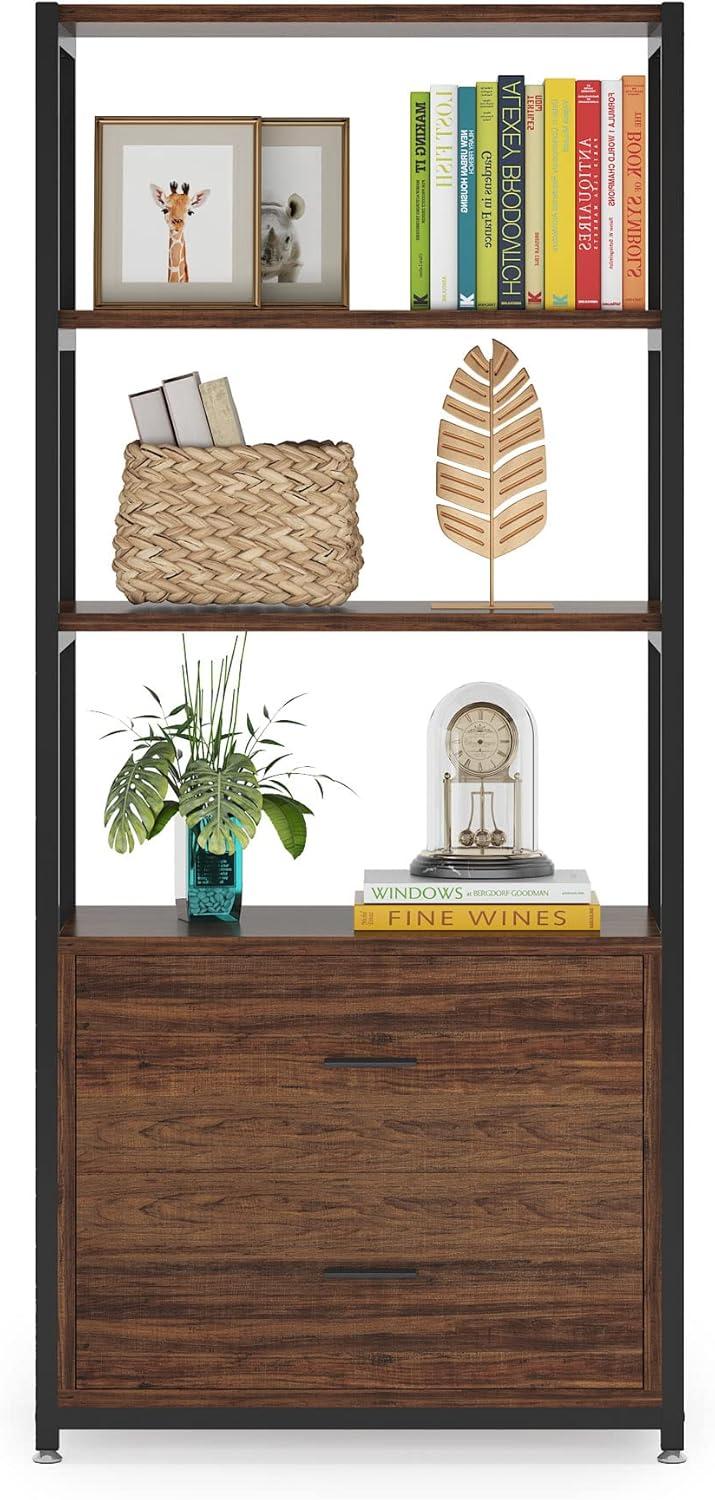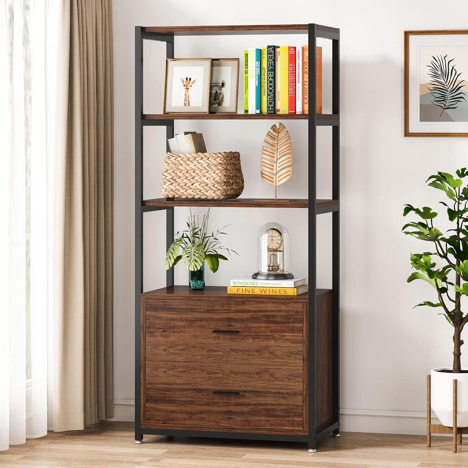 we found this 4-tier rustic bookshelf impressively adaptable across different environments, seamlessly blending functionality and style.Whether placed in a cozy living room or a professional office, its design provides an ideal balance between open shelving and concealed storage. The two spacious drawers offer a discreet spot for essentials that need to stay organized but out of sight. Its sturdy steel frame and durable laminated particle panels ensure stability and resistance against scratches or dents, even on uneven floors. With shelves supporting up to 35 pounds each, it comfortably holds books, decorative items, office supplies, and electronics without risk of tipping, provided it’s positioned on a level surface.