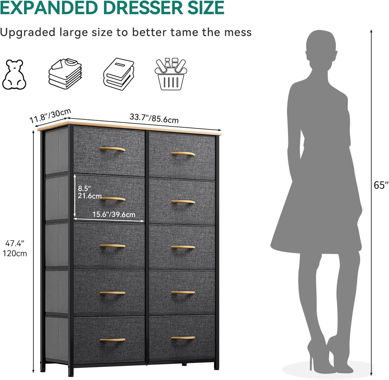 With 10 spacious fabric drawers, this dresser offers a versatile storage solution that caters to various organizational needs. Each drawer comfortably fits 11-15 dresses or 6-10 pairs of pants, giving us plenty of room to sort clothes by type, season, or even family member.The different drawer sizes add a practical benefit, allowing us to store bulkier items like sweaters or linens alongside smaller accessories, creating a neat and orderly environment. Plus, fabric drawers are lightweight and foldable, so rearranging the storage layout or transporting the unit is hassle-free.