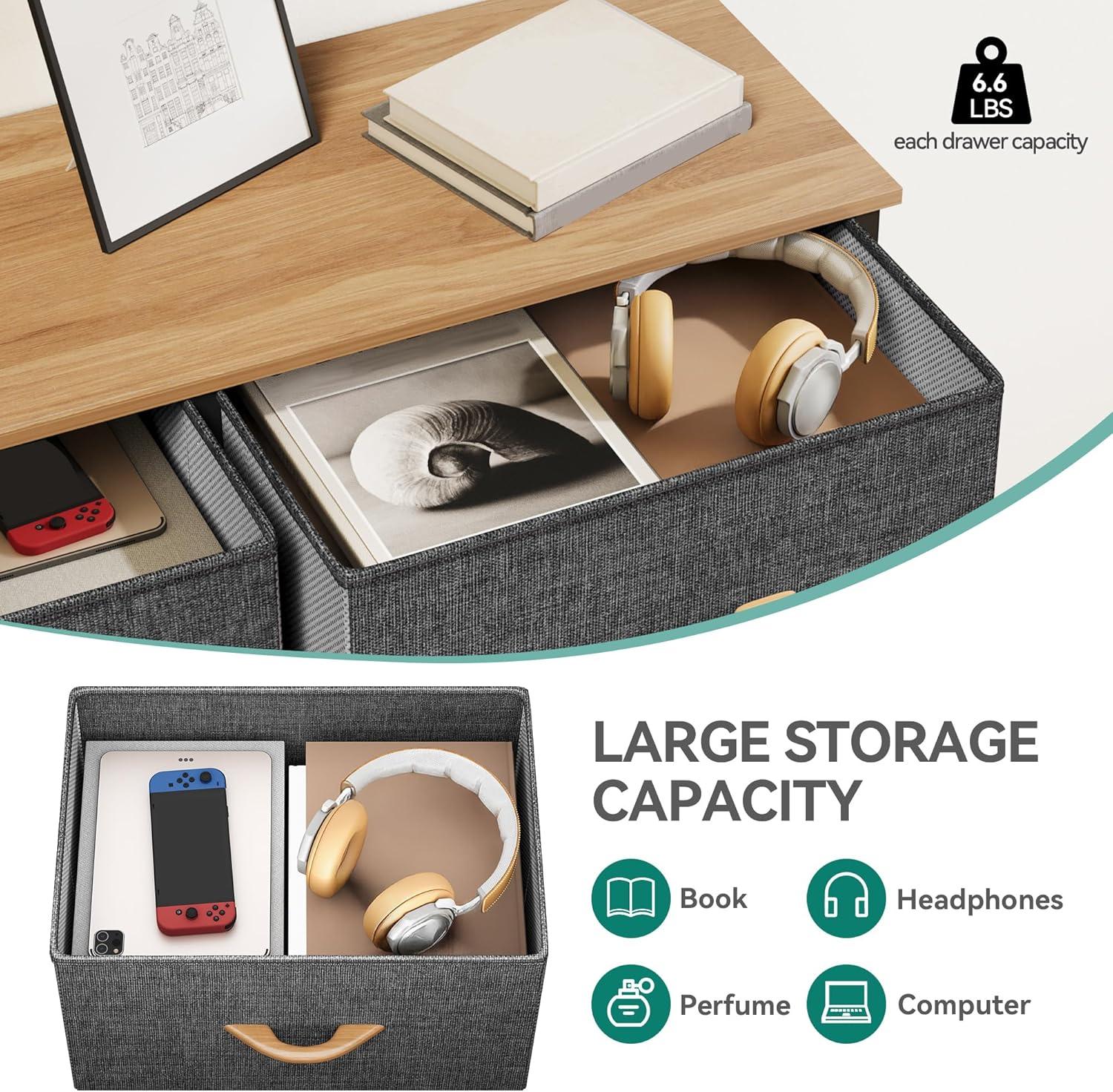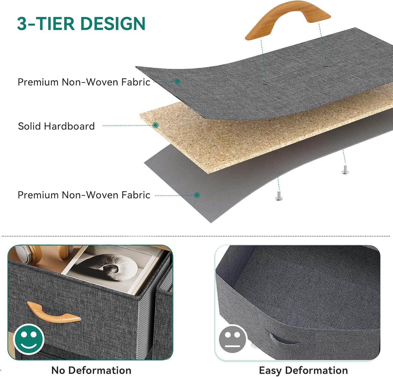 Our time with this storage unit has been marked by its remarkable combination of practicality and style. The assembly process was straightforward, requiring only basic tools that came in the package, and the clear instructions along with an installation video made setup hassle-free. Its durable frame crafted from sturdy metal and topped with a sleek wooden surface gives it a solid structure while maintaining a modern aesthetic. The breathable, non-woven fabric drawers are not only lightweight and easy to clean but also foldable and removable, providing flexible storage options throughout different rooms in our home.