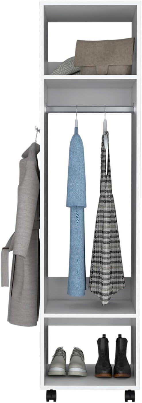 We found the design strikes a harmonious balance between generous storage and elegant simplicity.The wardrobe’s two spacious shelves provide ample room for folded clothes, shoes, and accessories, while the sturdy hanging rod easily accommodates shirts, dresses, and jackets without feeling cramped.this combination offers versatile organization, allowing us to keep everything neatly arranged without overcrowding the space.crafted from high-quality engineered wood with a pristine white finish, it effortlessly brightens the room and complements a wide range of bedroom decors.