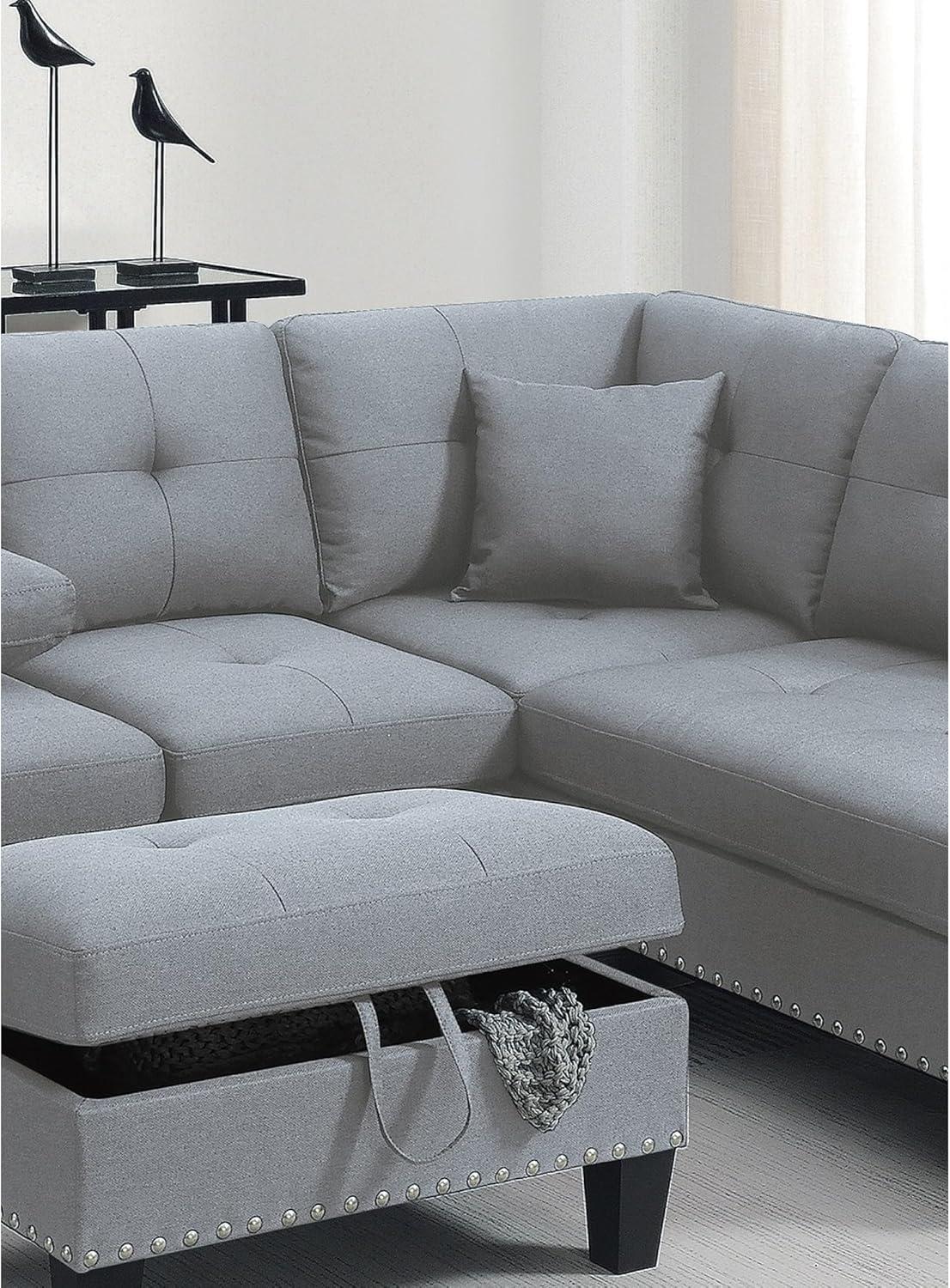 Our experience with this sectional set has been quite positive, especially given its versatility and thoughtful design.The neutral taupe grey tone blends effortlessly with a variety of décor styles,making it a seamless addition to our living space. The linen-like fabric adds a soft, inviting texture while maintaining durability, and the nailhead trim combined with subtle tufting on the back cushions lends a refined, traditional touch without overwhelming the modern aesthetic.Medium-firm seating strikes a comfortable balance-supportive yet cozy-making it perfect for long family gatherings or quiet evenings. We also appreciate that the chaise offers ample lounging space, and the storage ottoman provides practical functionality that helps keep our area tidy.