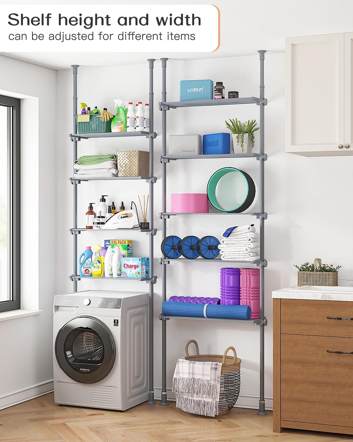 From our daily experience, the combination of metal poles and engineered wood shelves offers a strong yet lightweight frame that stands up well to regular use. The metal components feel robust and resist bending, while the shelves themselves are surprisingly sturdy, each supporting up to 30 lbs without any noticeable sagging. The dark grey finish not only lends a sleek, industrial vibe but also hides minor scuffs and fingerprints, which helps maintain a clean, well-kept appearance over time. We particularly appreciate the tension-mounted design-this floor-to-ceiling method keeps the unit stable without damaging walls, provided your ceiling is flat and firm.