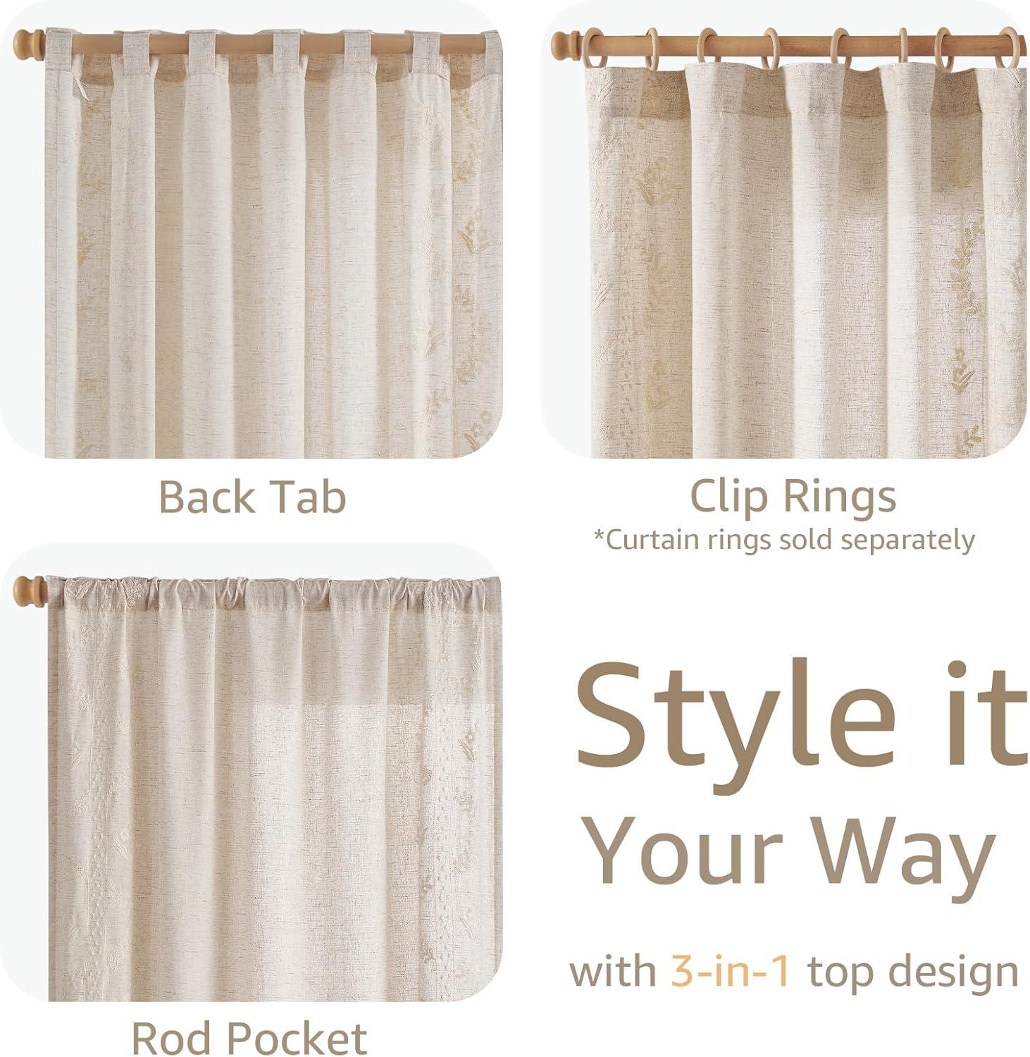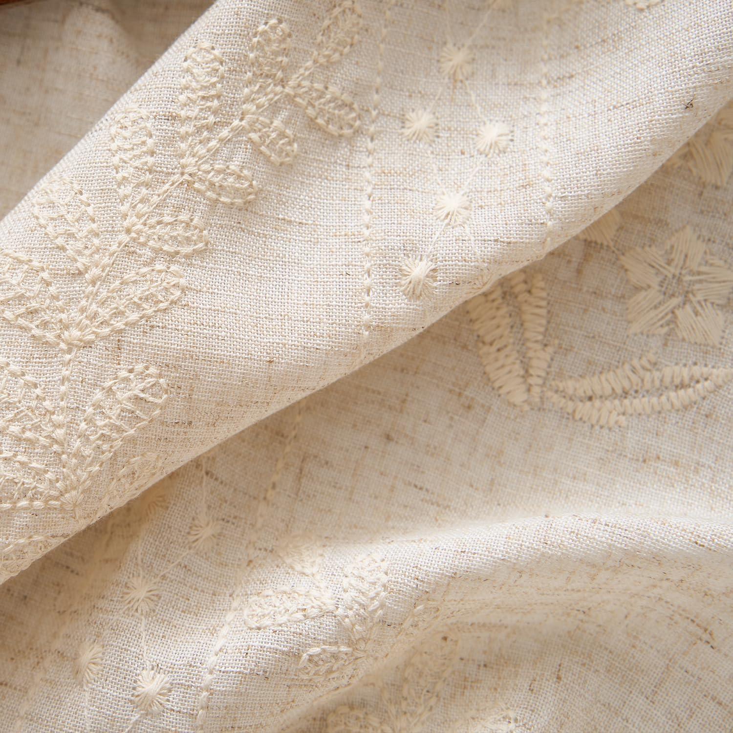 Late afternoon light softens as the ivory panels filter it, turning the window into a quiet, gauzy backdrop. You find your fingers lingering on the linen-like weave; the embroidered flower motifs are delicate but definite, raised slightly where the thread catches the eye. The jinchan Belrose four-panel set, at its full 84-inch length, reads as tall and grounding—the panels have a modest visual weight and a gentle sway when you pull them. Seen from the couch the pattern feels like a faded garden; up close the texture and stitched borders give the fabric a lived-in, tactile presence.