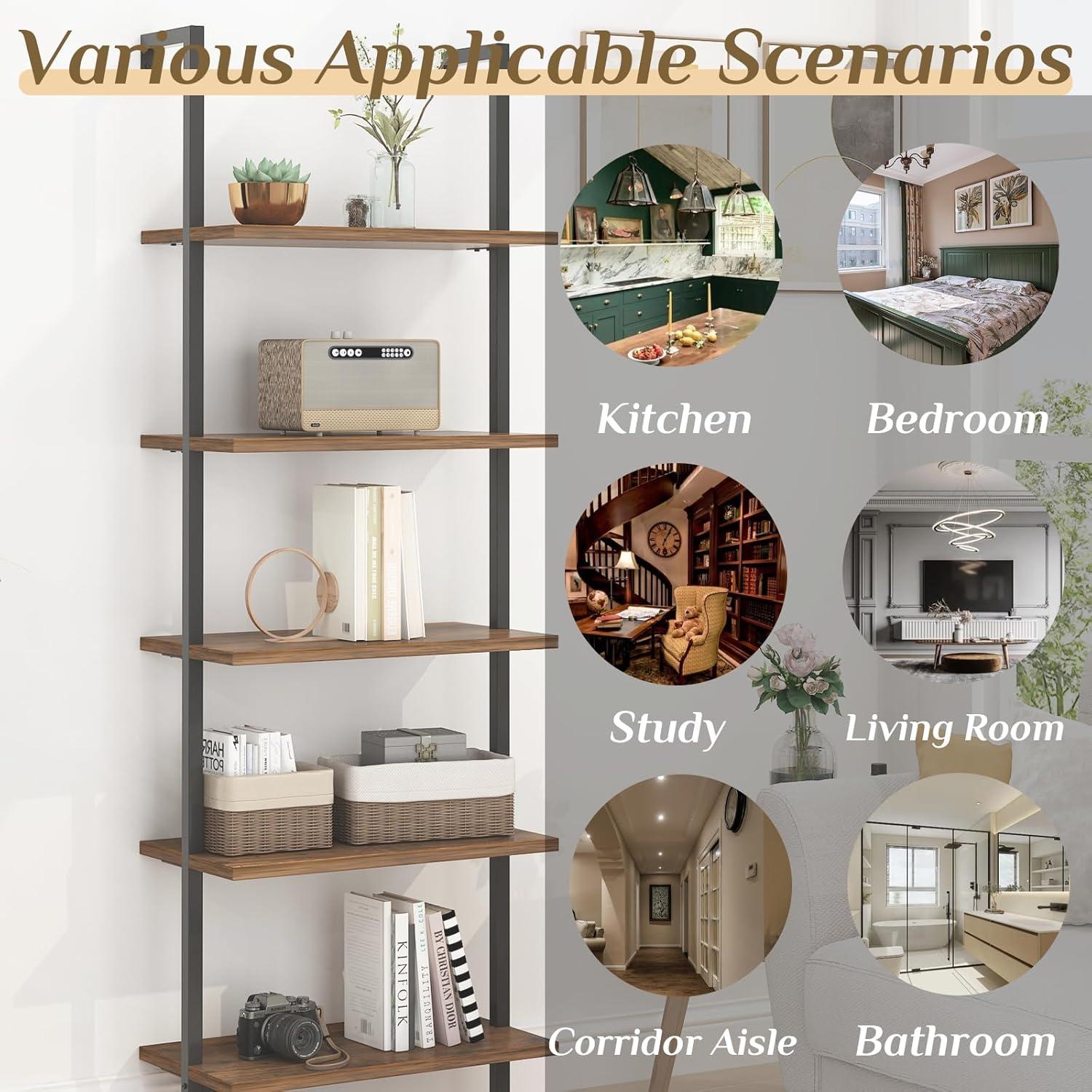 Over time you notice the Karl home Ladder Shelf 5 Tier Wall Mounted bookcase with Metal Frame, Open Design Shelves for Living Room, Bedroom, Home, Office, Rustic Brown (23.6″ L x 11.8″ W x 70.9″ H) slipping into the room’s daily rhythms rather than standing out. In daily routines it gathers the usual bits — a leaning stack of magazines, a mug left between uses, the faint dulling at shelf edges where hands brush — little marks that mark comfort and use. You watch how it nudges where you set things down and how the space around it reorients, quietly shaping movement as the room is used. In the end it simply stays.