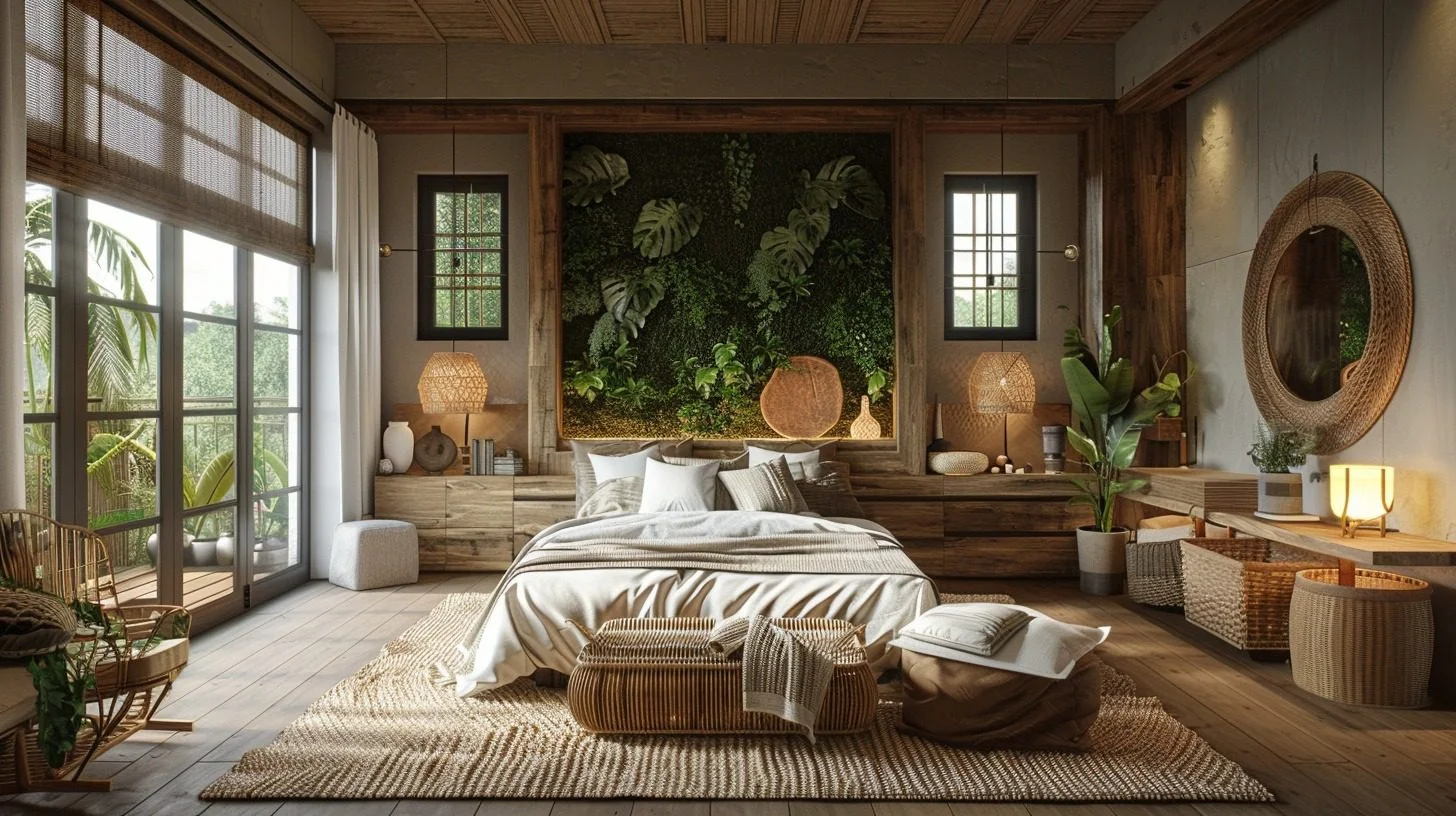 Natural Sophistication blends organic materials and muted earth tones to create a grounded yet elegant boho bedroom. Incorporate wooden headboards, linen bedding, and ceramic accents to foster a connection with nature while maintaining a refined aesthetic. This style suits those who appreciate understated luxury and natural beauty.