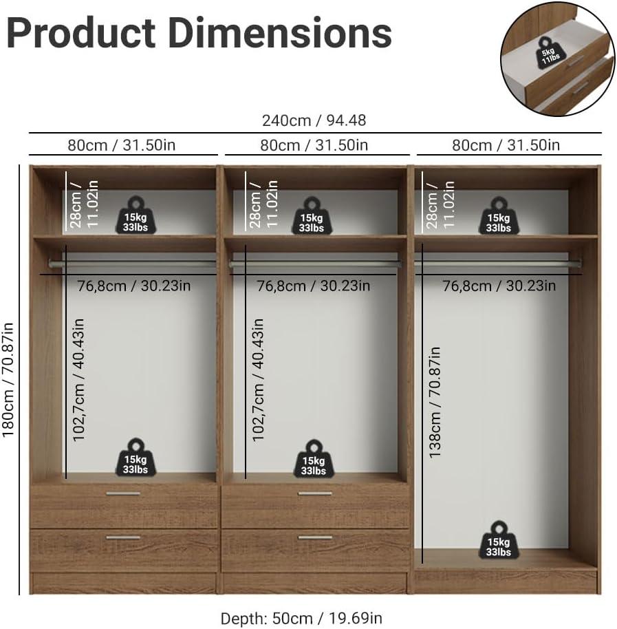 On first sight the unit reads as a long, horizontal element: its breadth tends to define whatever wall it occupies, leaving other furnishings to negotiate around that band. The rustic finish breaks up the surface and, under different light, the tone can appear warmer in morning sun and cooler under artificial lamps. Doors and drawer fronts create a regular rhythm across the face; when opened, the doors reveal deep compartments and the drawers slide out to a pleasant reach, so daily interactions—reaching for a coat, sliding a drawer—feel like part of the room’s routine rather than an isolated task. Placed against a flat wall and anchored,the wardrobe sits flush most of the time,though small gaps or a slightly uneven alignment can show on floors that aren’t perfectly level.