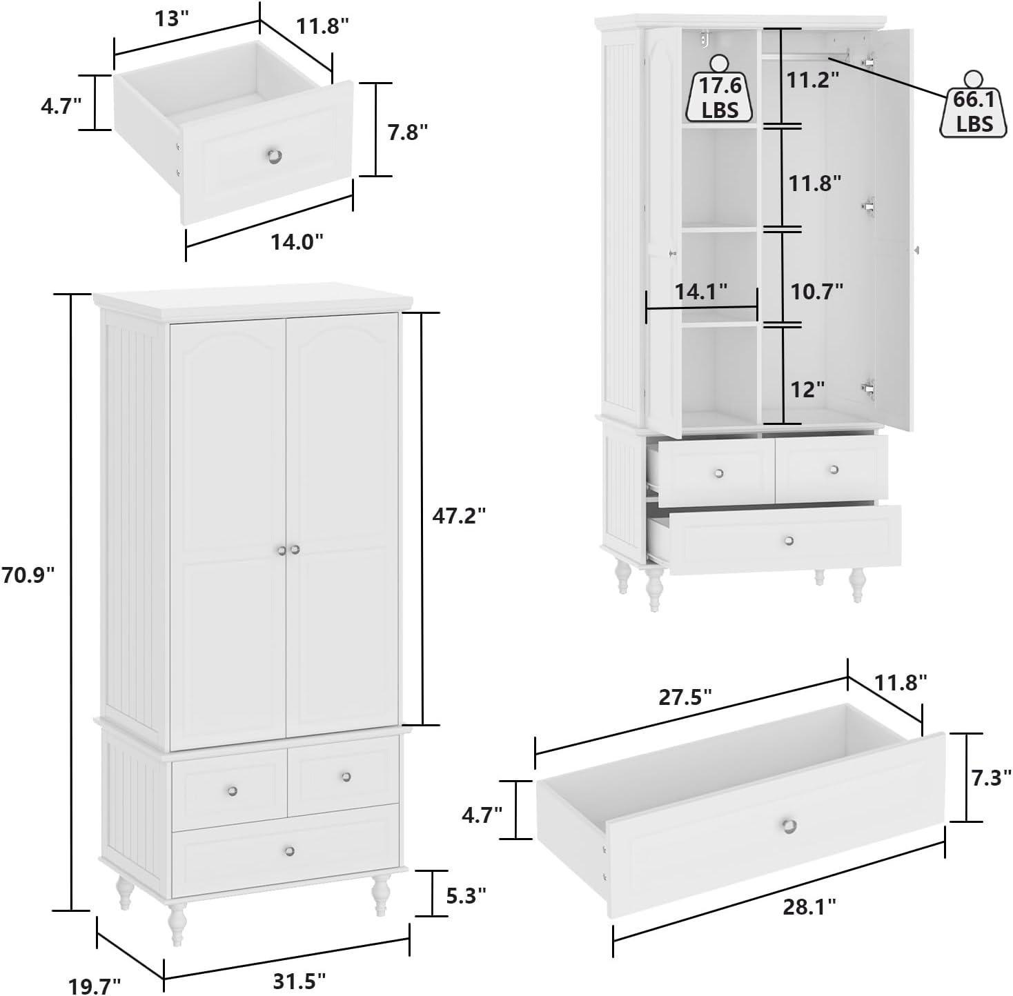 The cabinet’s design strikes a perfect balance between modern minimalism and functional elegance. Its clean white finish lends a fresh, airy feel that effortlessly complements a variety of bedroom styles. The unit’s proportions (19.7″ depth, 31.5″ width, and 70.9″ height) make it a compact yet impactful storage piece, ideal for tight spaces without compromising capacity. Behind the double doors, the strategic combination of shelves and a sturdy hanging rod offers versatile storage for folded clothes, bags, and garments needing to hang freely. The smooth-gliding mechanisms of the three drawers add a subtle touch of sophistication, enhancing convenience while maintaining a sleek profile.