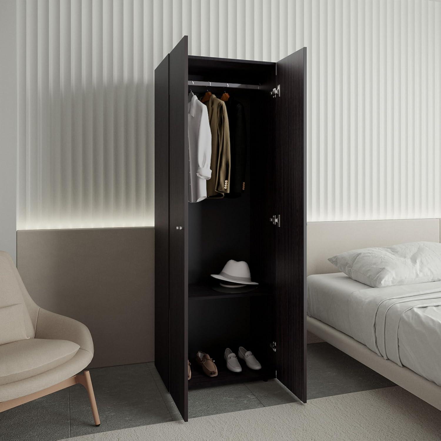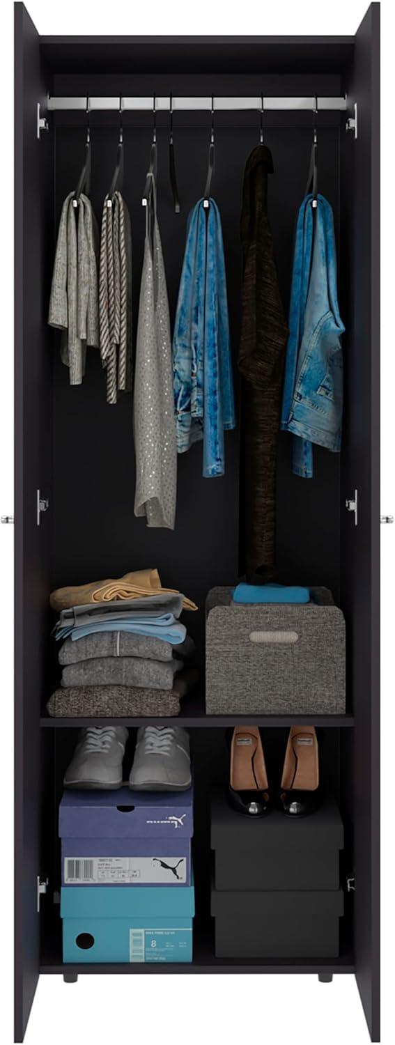 upon unboxing,we were immediately impressed by the sleek,contemporary design that effortlessly blends with various bedroom styles.The compact footprint of 66.9” H x 23.6” W x 15.7” D makes it a perfect fit for tighter spaces like small bedrooms and apartments without compromising on storage capacity. The engineered wood construction feels sturdy yet refined, promising durability while maintaining a clean aesthetic. The two-door design neatly conceals all belongings, helping us maintain a clutter-free surroundings with ease.