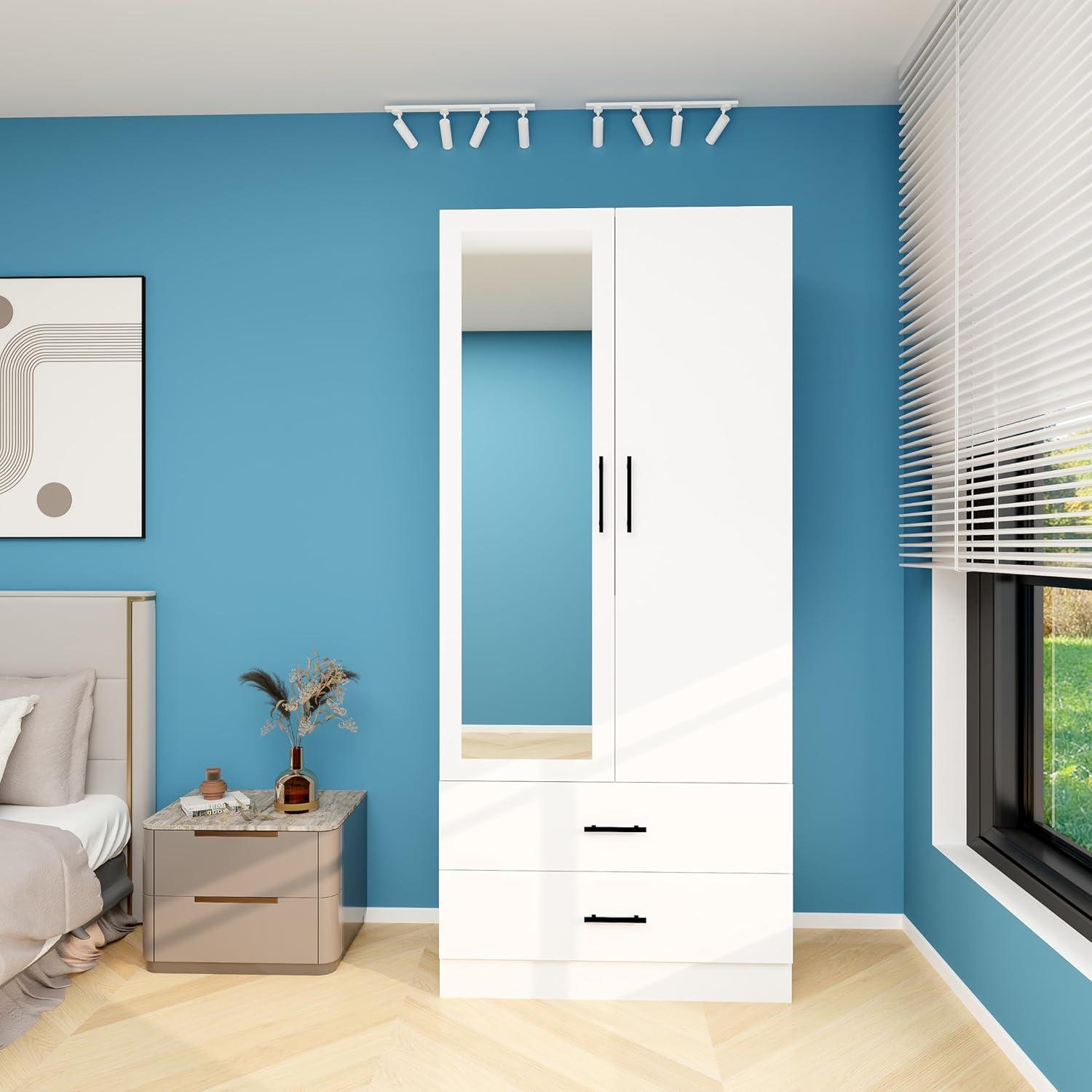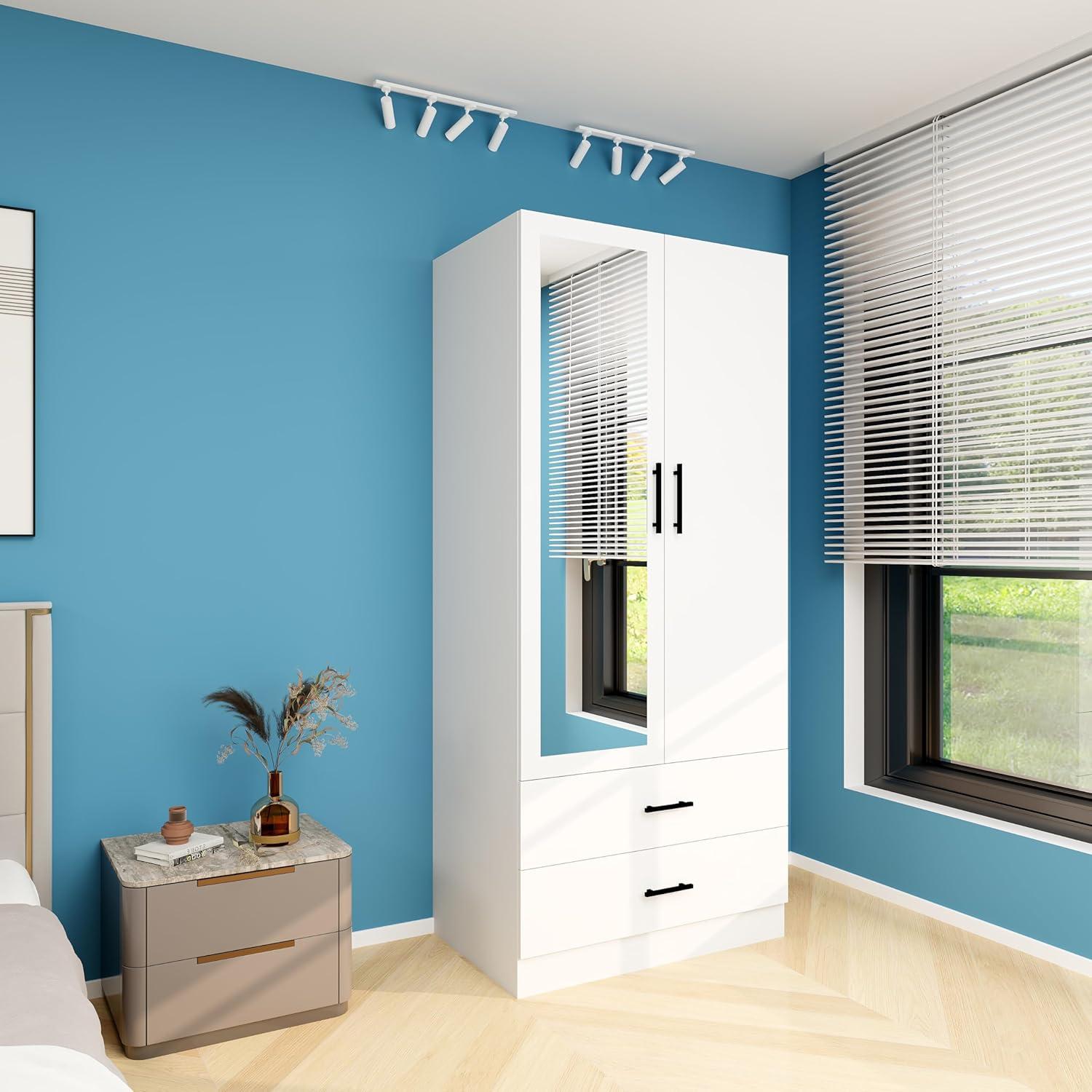 At 71 inches tall, this wardrobe offers a thoughtfully designed storage solution that fits a wide range of needs.Inside, we find a spacious hanging rod perfect for dresses, suits, or coats, complemented by two sizable storage drawers ideal for folded garments, accessories, or linens. The vertical arrangement maximizes usable space without overwhelming the room, and the full-length mirror on the front adds functional elegance, allowing us to quickly check our outfits as we decide what to wear. This integration of mirror and storage minimises the need for additional furniture pieces,keeping our bedroom uncluttered yet stylish.
