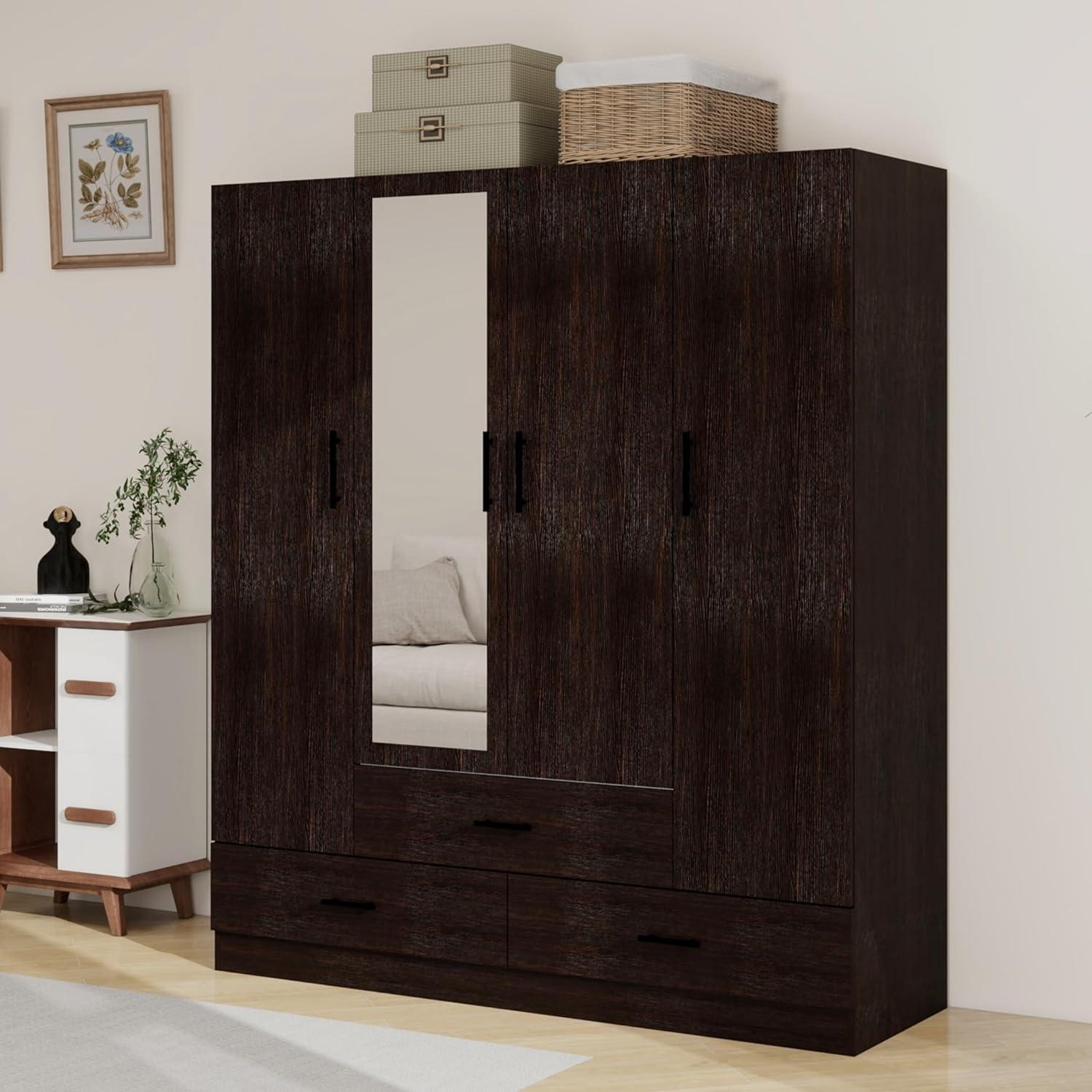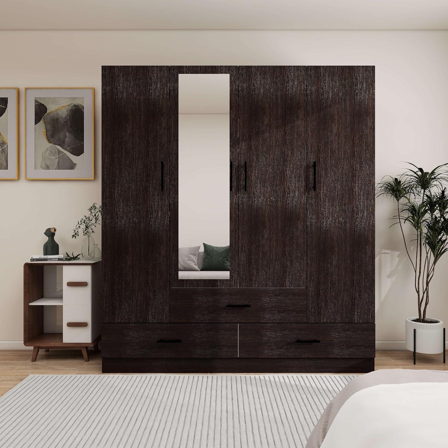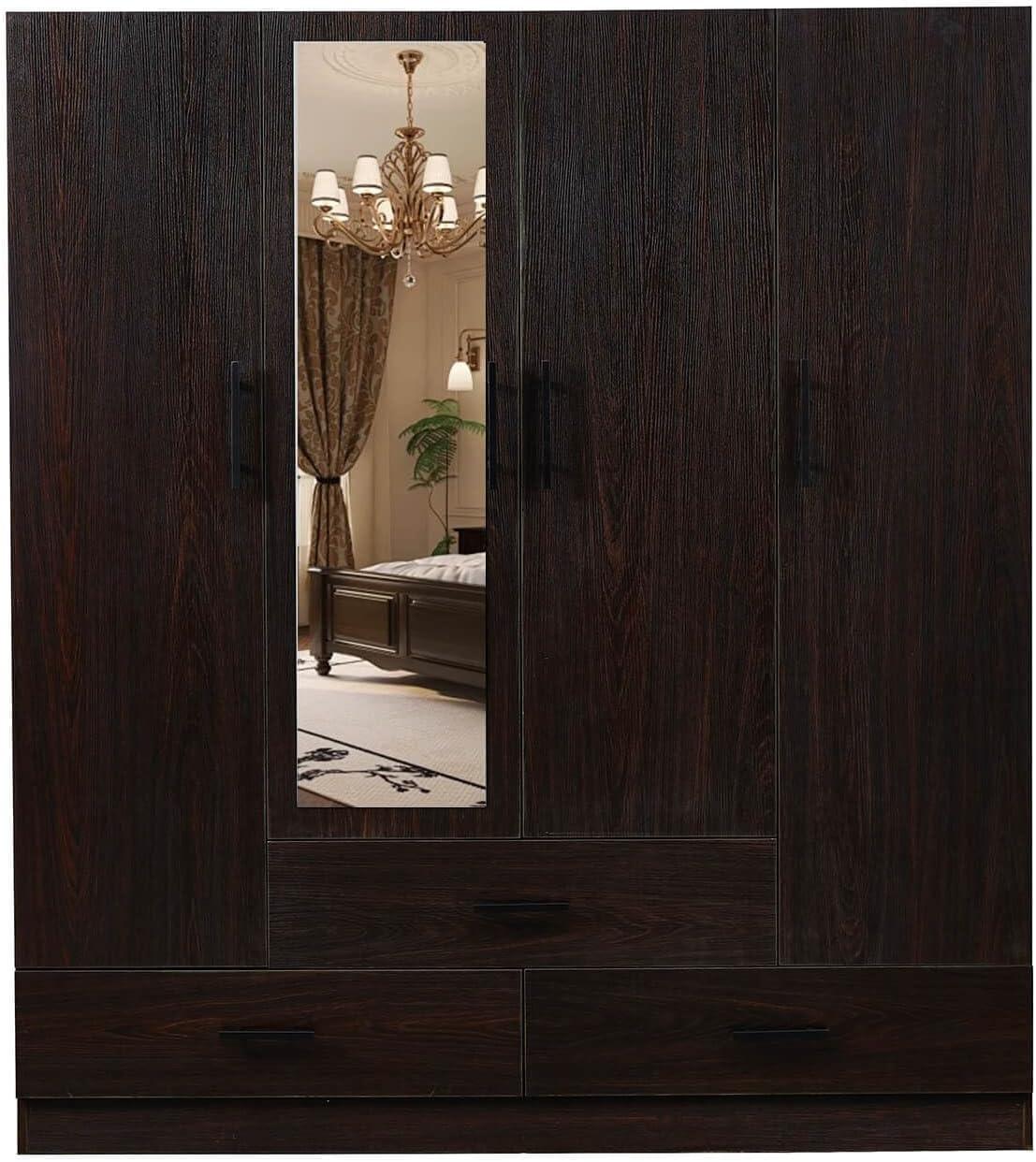 This wardrobe impresses with its generous storage options, tailored to keep our bedroom organized and clutter-free.Featuring four doors that open to reveal two hanging rods, it cleverly accommodates longer garments such as dresses and coats without wrinkling. Below these, there are three spacious drawers-perfect for folded clothes, accessories, or everyday essentials-ensuring every item has an assigned spot that’s easy to access. The inclusion of a full-length mirror adds both practicality and a touch of elegance, making this cabinet not just a storage piece, but a gorgeous bedroom focal point that enhances our daily routine.