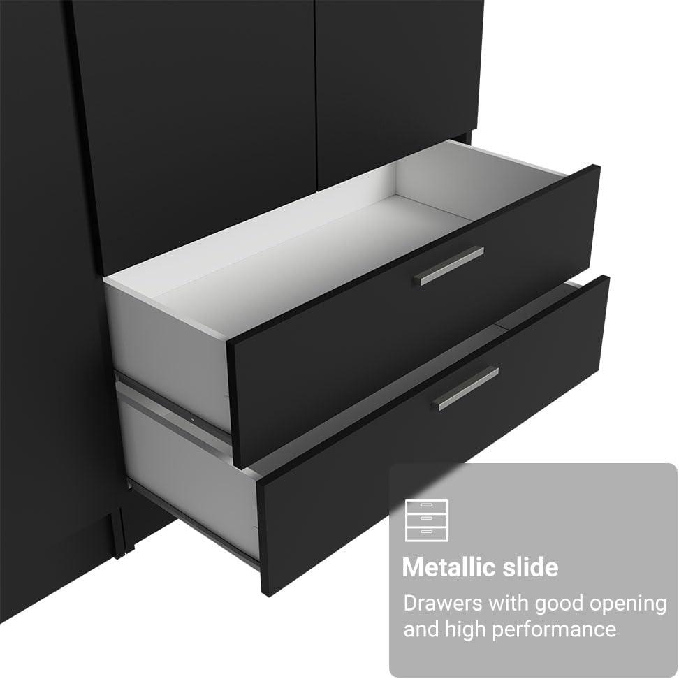 Beyond its visual appeal, the black surface also subtly emphasizes the wardrobe’s craftsmanship, complementing the natural wood grain texture beneath its durable finish. This combination creates an understated elegance that fits perfectly with minimalist or contemporary décor. Additionally, the dark hue helps conceal minor scuffs or dust, keeping the unit looking pristine longer. Here’s what we love about the black finish: