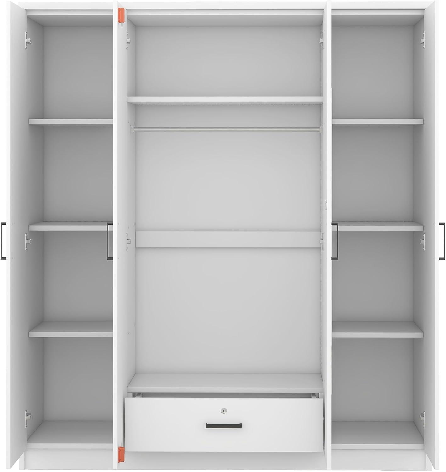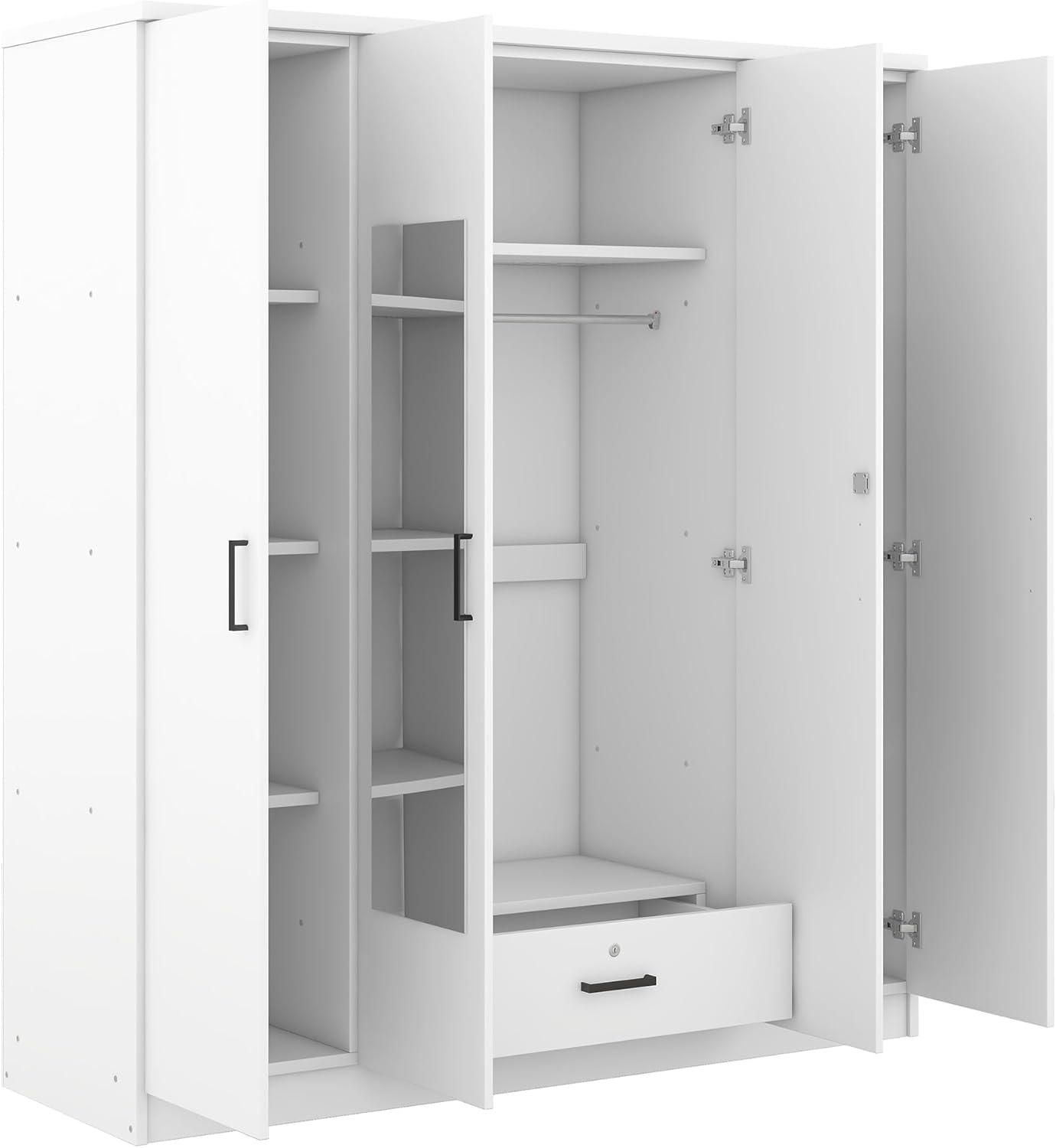 We truly appreciate how the design thoughtfully combines multiple storage options to keep our wardrobe beautifully organized without sacrificing style. The inclusion of spacious shelves, smooth-gliding drawers, and a sturdy hanging rail makes it simple to allocate space for different clothing items and accessories.What stands out is the locking top drawer, perfect for securing confidential or valuable belongings, adding an extra layer of practicality. The MDF construction ensures durability, while the sleek black handles complement the overall modern white finish, blending effortlessly into most bedroom decors.