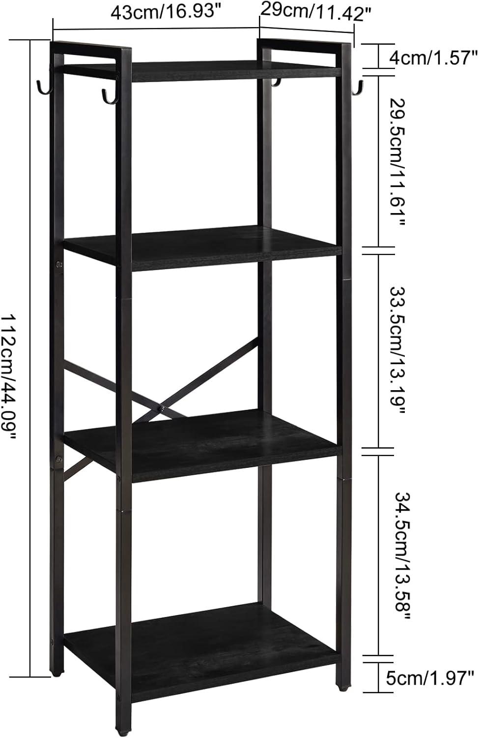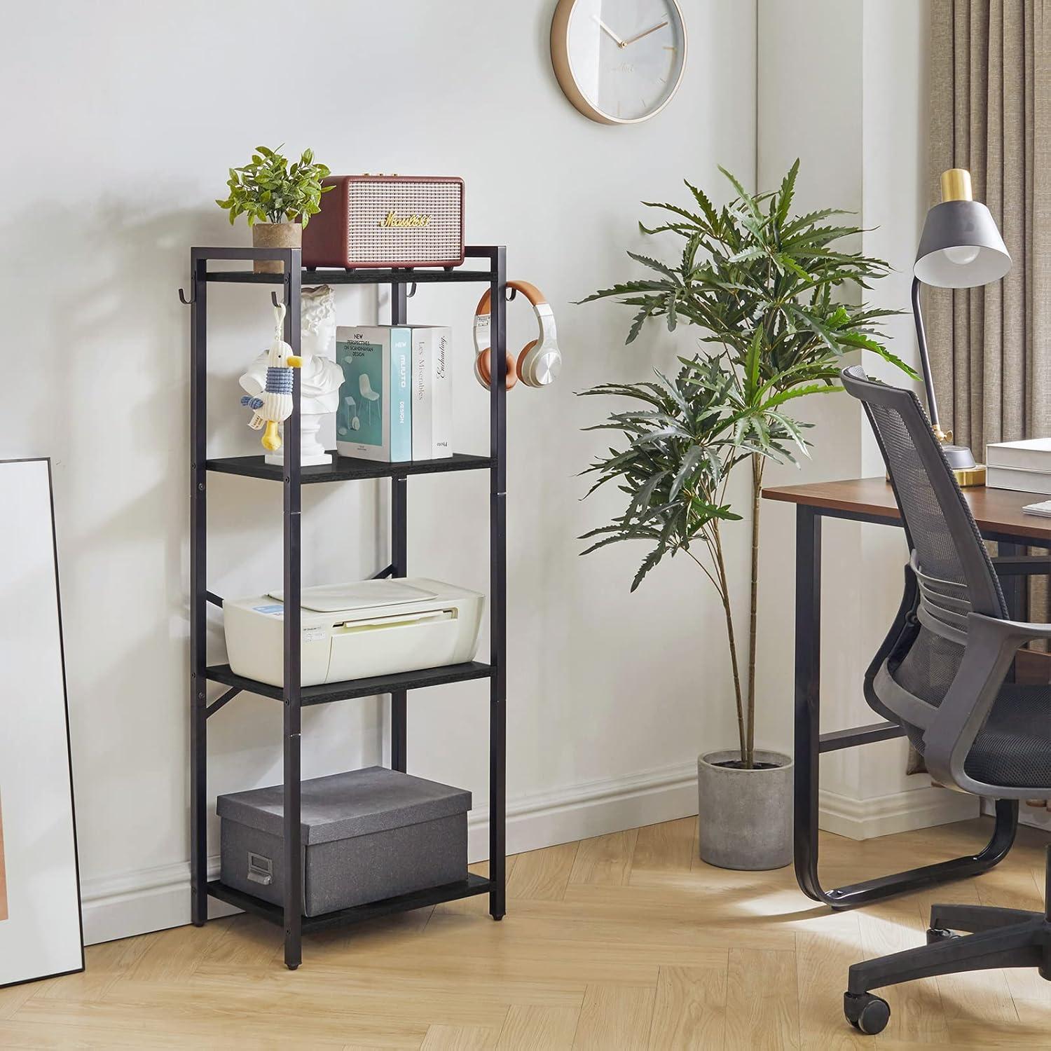 In the home office, its narrow footprint and sturdy build make it an excellent choice for organizing books, files, and office supplies without crowding your workspace. The 4-tier design provides ample storage surface while maintaining a compact profile, perfect for tight corners or between desks. Its adjustable feet ensure stability on uneven floors, and the metal frame with X-bracing adds confidence when holding heavier items.Plus, the included S-shaped hooks on the sides come in handy for hanging lightweight essentials like keys or lanyards.