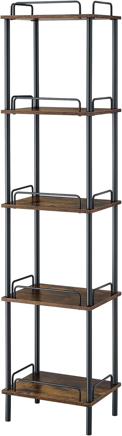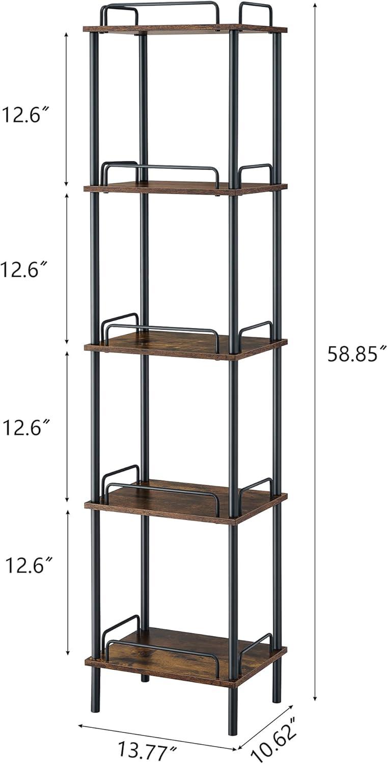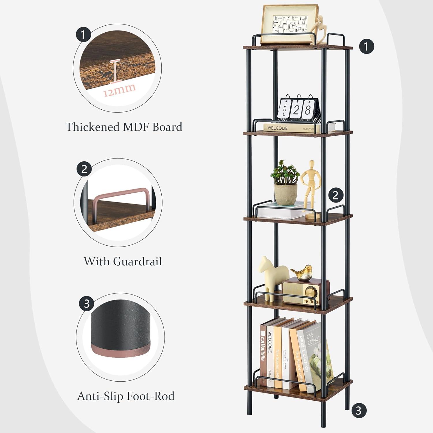 We found this tall,narrow bookshelf to be an excellent space-saving solution for various corners around our home. Its 5-tier design maximizes vertical storage without crowding our floors, making it a great fit for tight spots in the living room, bedroom, and even the bathroom. The combination of rustic brown wood grain and sleek black metal adds a subtle industrial charm that effortlessly complements different decor styles. Each tier’s built-in guardrail reassures us that our books, plants, and precious décor pieces stay secure, even in high-traffic areas.