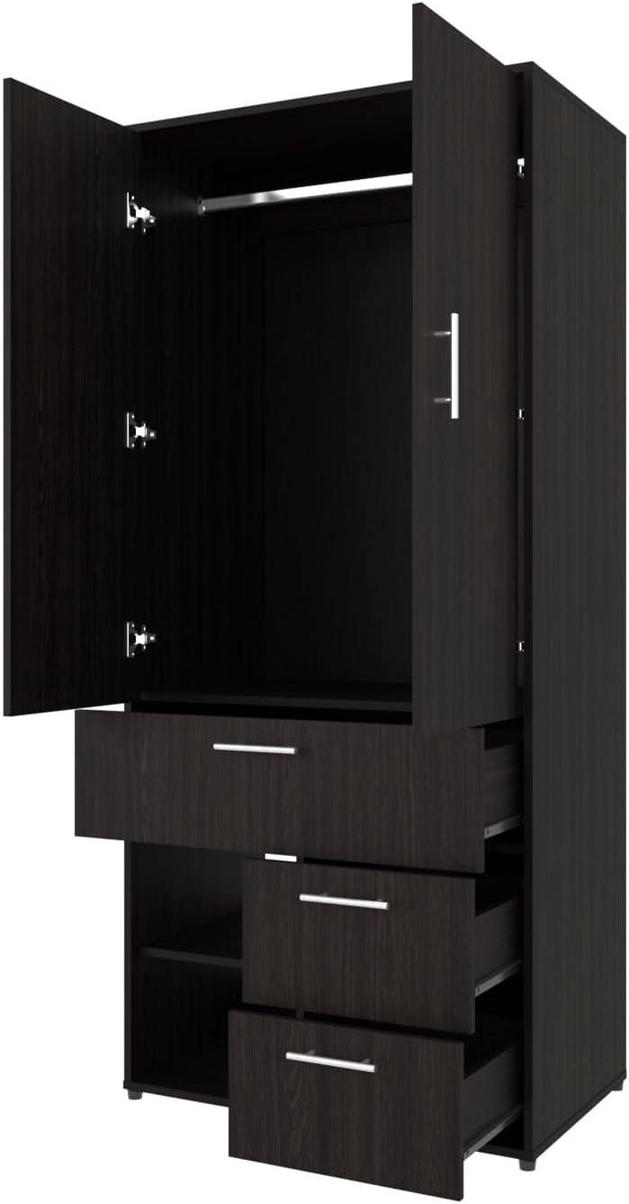 Upon frist glance, this wardrobe impresses with its sleek, modern silhouette and space-conscious design, making it an excellent choice for smaller bedrooms or minimalist setups. The wenge finish adds warmth and sophistication, perfectly blending with various interior styles. Crafted from particle board with a scratch-resistant melamine coating, it promises durability while maintaining a polished look even with daily use. The double doors feature elegant vertical handles, enhancing both aesthetics and ease of access. Once opened, a thoughtfully designed interior reveals a sturdy hanging rod for wrinkle-free clothes and a roomy upper cabinet ideal for seasonal or bulky items.